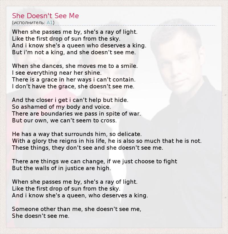 When she passes me by, she's a ray of light. Like the first drop of sun from the sky. And i know she's a queen who deserves a king. But i'm not a king, and she doesn't see me. When she dances, she moves me to a smile. I see everything near her shine. There is a grace in her ways i can't contain. I don't have the grace, she doesn't see me. And the closer i get i can't help but hide. So ashamed of my body and voice. There are boundaries we pass in spite of war. But our own, we can't seem to cross. He has a way that surrounds him, so delicate. With a glory the reigns in his life, he is also so much that he is not. These things, they don't see and she doesn't see me. There are things we can change, if we just choose to fight But the walls of in justice are high. When she passes me by, she's a ray of light. Like the first drop of sun from the sky. And i know she's a queen, who deserves a king. Someone other than me, she doesn't see me, She doesn't see me.
