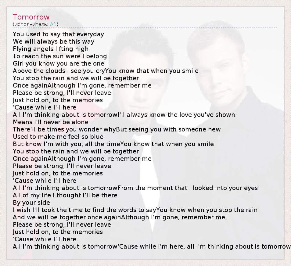 You used to say that everyday We will always be this way Flying angels lifting high To reach the sun were I belong Girl you know you are the one Above the clouds I see you cryYou know that when you smile You stop the rain and we will be together Once againAlthough I'm gone, remember me Please be strong, I'll never leave Just hold on, to the memories 'Cause while I'll here All I'm thinking about is tomorrowI'll always know the love you've shown Means I'll never be alone There'll be times you wonder whyBut seeing you with someone new Used to make me feel so blue But know I'm with you, all the timeYou know that when you smile You stop the rain and we will be together Once againAlthough I'm gone, remember me Please be strong, I'll never leave Just hold on, to the memories 'Cause while I'll here All I'm thinking about is tomorrowFrom the moment that I looked into your eyes All of my life I thought I'll be there By your side I wish I'll took the time to find the words to sayYou know when you stop the rain And we will be together once againAlthough I'm gone, remember me Please be strong, I'll never leave Just hold on, to the memories 'Cause while I'll here All I'm thinking about is tomorrow'Cause while I'm here, all I'm thinking about is tomorrow