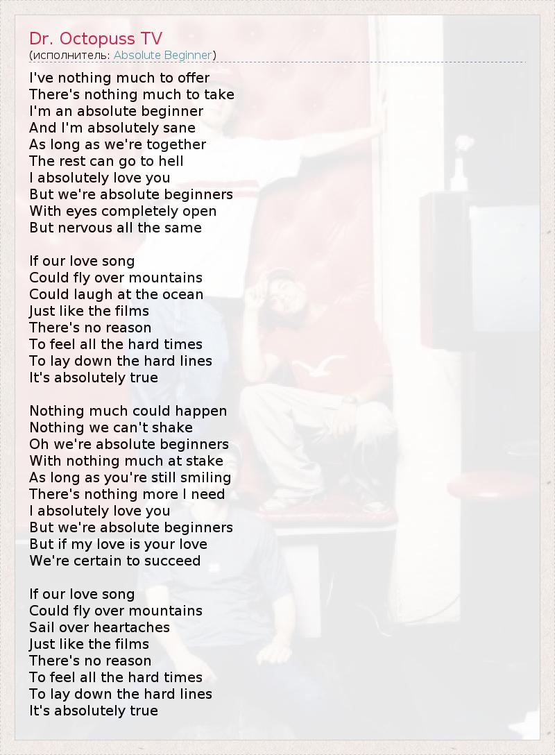 Я немного могу предложить, С меня немного можно взять - Я начинаю все с абсолютного начала, И я в абсолютном здравии ума. Пока мы с тобой вместе, Пусть остальные летят ко всем чертям, Моя любовь к тебе абсолютна, И мы начинаем все с абсолютного начала, Наши глаза широко открыты, Но мы все равно волнуемся. О, если бы наша любовь Могла бы полететь над горами, Могла бы смеяться над океаном, Прямо как в кино! Совсем ни к чему сейчас Вспоминать плохое, Готовиться к тяжелой судьбе... И это абсолютная правда. Ничего не может случиться, Ничего такого, что бы мы не преодолели, О, мы начинаем все с абсолютного начала, И нам нечего ставить на карту. Пока ты улыбаешься, Мне не нужно ничего другого, Моя любовь к тебе абсолютна, И мы начинаем все с абсолютного начала, Но если моя любовь - это твоя любовь, То у нас точно все получится. О, если бы наша любовь Могла бы полететь над горами, Могла бы смеяться над океаном, Прямо как в кино! Совсем ни к чему сейчас Вспоминать плохое, Готовиться к тяжелой судьбе... И это абсолютная правда.