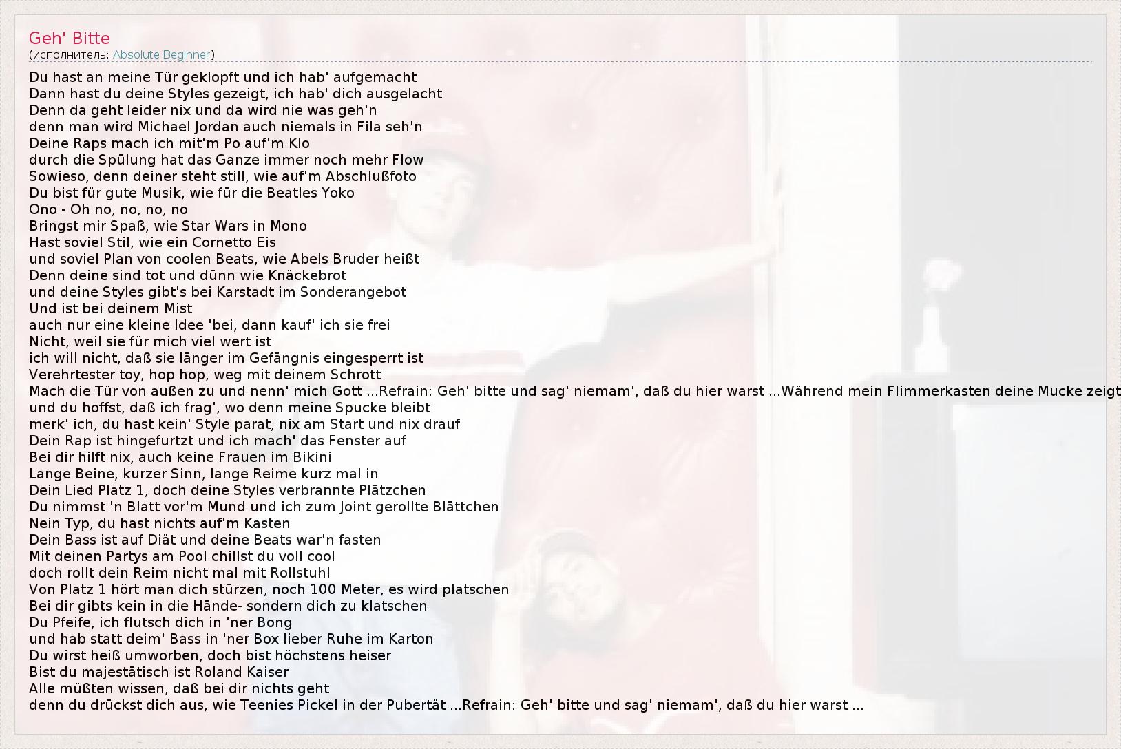 Du hast an meine Tür geklopft und ich hab' aufgemacht Dann hast du deine Styles gezeigt, ich hab' dich ausgelacht Denn da geht leider nix und da wird nie was geh'n denn man wird Michael Jordan auch niemals in Fila seh'n Deine Raps mach ich mit'm Po auf'm Klo durch die Spülung hat das Ganze immer noch mehr Flow Sowieso, denn deiner steht still, wie auf'm Abschlußfoto Du bist für gute Musik, wie für die Beatles Yoko Ono - Oh no, no, no, no Bringst mir Spaß, wie Star Wars in Mono Hast soviel Stil, wie ein Cornetto Eis und soviel Plan von coolen Beats, wie Abels Bruder heißt Denn deine sind tot und dünn wie Knäckebrot und deine Styles gibt's bei Karstadt im Sonderangebot Und ist bei deinem Mist auch nur eine kleine Idee 'bei, dann kauf' ich sie frei Nicht, weil sie für mich viel wert ist ich will nicht, daß sie länger im Gefängnis eingesperrt ist Verehrtester toy, hop hop, weg mit deinem Schrott Mach die Tür von außen zu und nenn' mich Gott ...Refrain: Geh' bitte und sag' niemam', daß du hier warst ...Während mein Flimmerkasten deine Mucke zeigt und du hoffst, daß ich frag', wo denn meine Spucke bleibt merk' ich, du hast kein' Style parat, nix am Start und nix drauf Dein Rap ist hingefurtzt und ich mach' das Fenster auf Bei dir hilft nix, auch keine Frauen im Bikini Lange Beine, kurzer Sinn, lange Reime kurz mal in Dein Lied Platz 1, doch deine Styles verbrannte Plätzchen Du nimmst 'n Blatt vor'm Mund und ich zum Joint gerollte Blättchen Nein Typ, du hast nichts auf'm Kasten Dein Bass ist auf Diät und deine Beats war'n fasten Mit deinen Partys am Pool chillst du voll cool doch rollt dein Reim nicht mal mit Rollstuhl Von Platz 1 hört man dich stürzen, noch 100 Meter, es wird platschen Bei dir gibts kein in die Hände- sondern dich zu klatschen Du Pfeife, ich flutsch dich in 'ner Bong und hab statt deim' Bass in 'ner Box lieber Ruhe im Karton Du wirst heiß umworben, doch bist höchstens heiser Bist du majestätisch ist Roland Kaiser Alle müßten wissen, daß bei dir nichts geht denn du drückst dich aus, wie Teenies Pickel in der Pubertät ...Refrain: Geh' bitte und sag' niemam', daß du hier warst ...