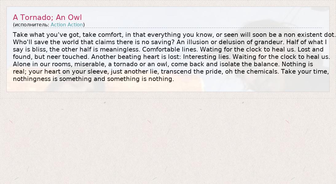 А как ты думаешь, о чем песня "A Tornado; An Owl" ?