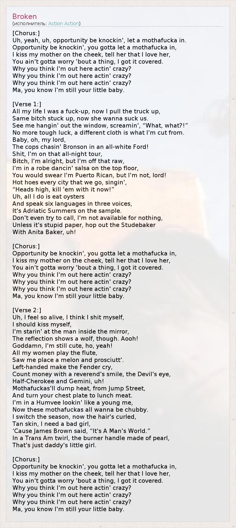 Uh, yeah, uh, opportunity be knockin', let a mothafucka in.