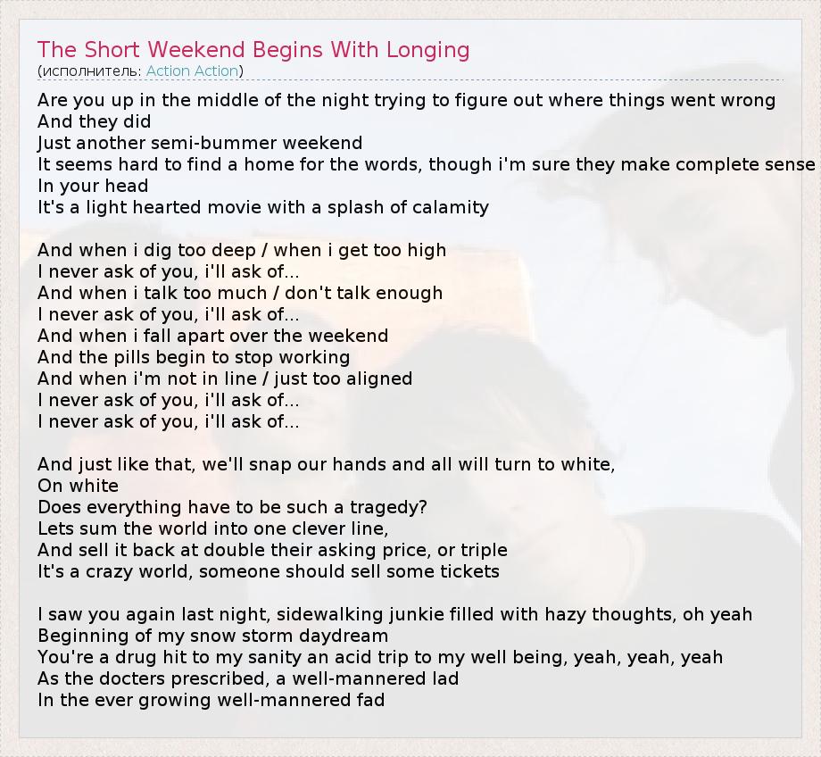 ГлавнаяИсполнителиAction ActionThe Short Weekend Begins With Longing