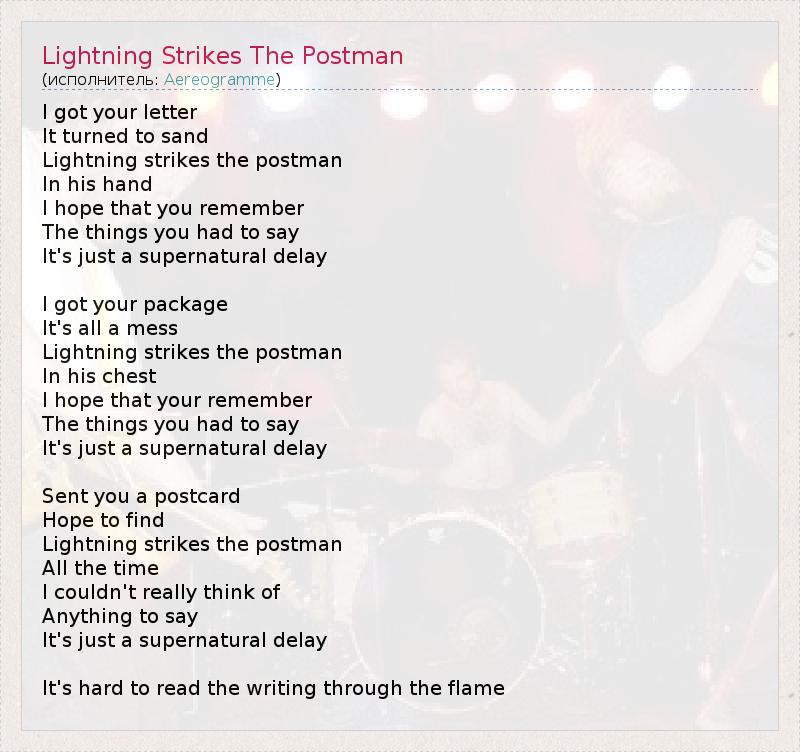 I got your letter It turned to sand Lightning strikes the postman In his hand I hope that you remember The things you had to say It's just a supernatural delay I got your package It's all a mess Lightning strikes the postman In his chest I hope that your remember The things you had to say It's just a supernatural delay Sent you a postcard Hope to find Lightning strikes the postman All the time I couldn't really think of Anything to say It's just a supernatural delay It's hard to read the writing through the flame
