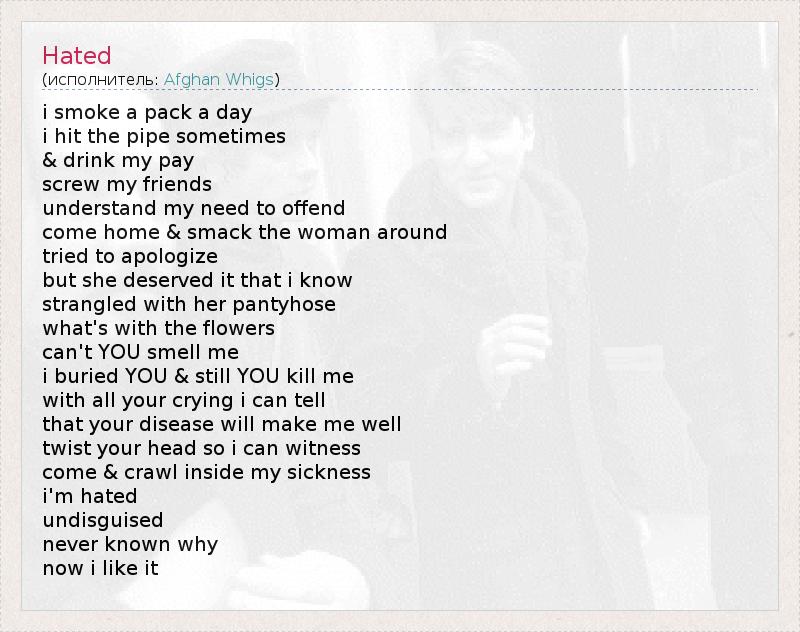 Это интересно:Afghan Whigs - американская альтернативная рок-группа. Образована в 1986 в Цинциннати (Огайо).Считается, что она принадлежит направлению гранж, но в ее музыке есть много традиционных течений: в альбоме «Uptown Avondale» присутствует много классических соул-мелодий, хотя в более раннем альбоме «Up In It» они исполняли роковые композиции в стиле кантри. Грег Далли (вокал, ритм-гитара), Рик Макколам... продолжение