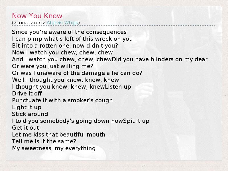 Since you're aware of the consequences I can pimp what's left of this wreck on you Bit into a rotten one, now didn't you? Now I watch you chew, chew, chew And I watch you chew, chew, chewDid you have blinders on my dear Or were you just willing me? Or was I unaware of the damage a lie can do? Well I thought you knew, knew, knew I thought you knew, knew, knewListen up Drive it off Punctuate it with a smoker's cough Light it up Stick around I told you somebody's going down nowSpit it up Get it out Let me kiss that beautiful mouth Tell me is it the same? My sweetness, my everything