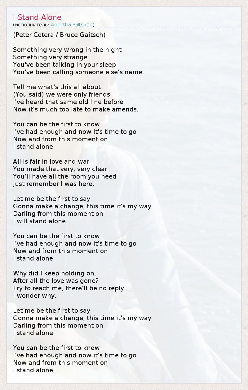 (Peter Cetera / Bruce Gaitsch) Something very wrong in the night Something very strange You've been talking in your sleep You've been calling someone else's name. Tell me what's this all about (You said) we were only friends I've heard that same old line before Now it's much too late to make amends. You can be the first to know I've had enough and now it's time to go Now and from this moment on I stand alone. All is fair in love and war You made that very, very clear You'll have all the room you need Just remember I was here. Let me be the first to say Gonna make a change, this time it's my way Darling from this moment on I will stand alone. You can be the first to know I've had enough and now it's time to go Now and from this moment on I stand alone. Why did I keep holding on, After all the love was gone? Try to reach me, there'll be no reply I wonder why. Let me be the first to say Gonna make a change, this time it's my way Darling from this moment on I stand alone. You can be the first to know I've had enough and now it's time to go Now and from this moment on I stand alone.
