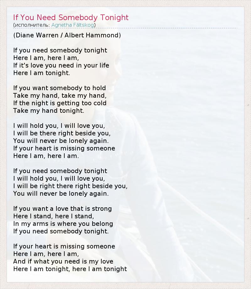 (Diane Warren / Albert Hammond) If you need somebody tonight Here I am, here I am, If it's love you need in your life Here I am tonight. If you want somebody to hold Take my hand, take my hand, If the night is getting too cold Take my hand tonight. I will hold you, I will love you, I will be there right beside you, You will never be lonely again. If your heart is missing someone Here I am, here I am. If you need somebody tonight I will hold you, I will love you, I will be right there right beside you, You will never be lonely again. If you want a love that is strong Here I stand, here I stand, In my arms is where you belong If you need somebody tonight. If your heart is missing someone Here I am, here I am, And if what you need is my love Here I am tonight, here I am tonight