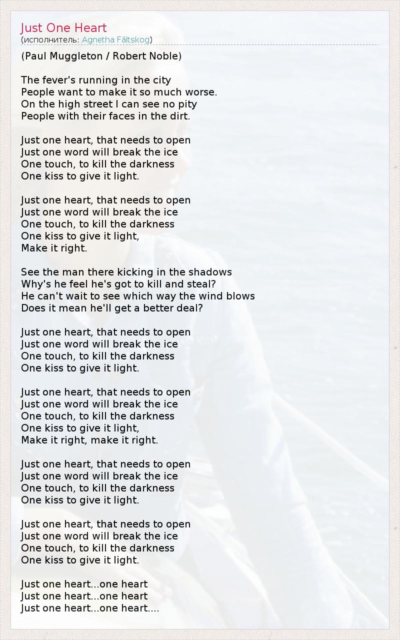 (Paul Muggleton / Robert Noble) The fever's running in the city People want to make it so much worse. On the high street I can see no pity People with their faces in the dirt. Just one heart, that needs to open Just one word will break the ice One touch, to kill the darkness One kiss to give it light. Just one heart, that needs to open Just one word will break the ice One touch, to kill the darkness One kiss to give it light, Make it right. See the man there kicking in the shadows Why's he feel he's got to kill and steal? He can't wait to see which way the wind blows Does it mean he'll get a better deal? Just one heart, that needs to open Just one word will break the ice One touch, to kill the darkness One kiss to give it light. Just one heart, that needs to open Just one word will break the ice One touch, to kill the darkness One kiss to give it light, Make it right, make it right. Just one heart, that needs to open Just one word will break the ice One touch, to kill the darkness One kiss to give it light. Just one heart, that needs to open Just one word will break the ice One touch, to kill the darkness One kiss to give it light. Just one heart...one heart Just one heart...one heart Just one heart...one heart....