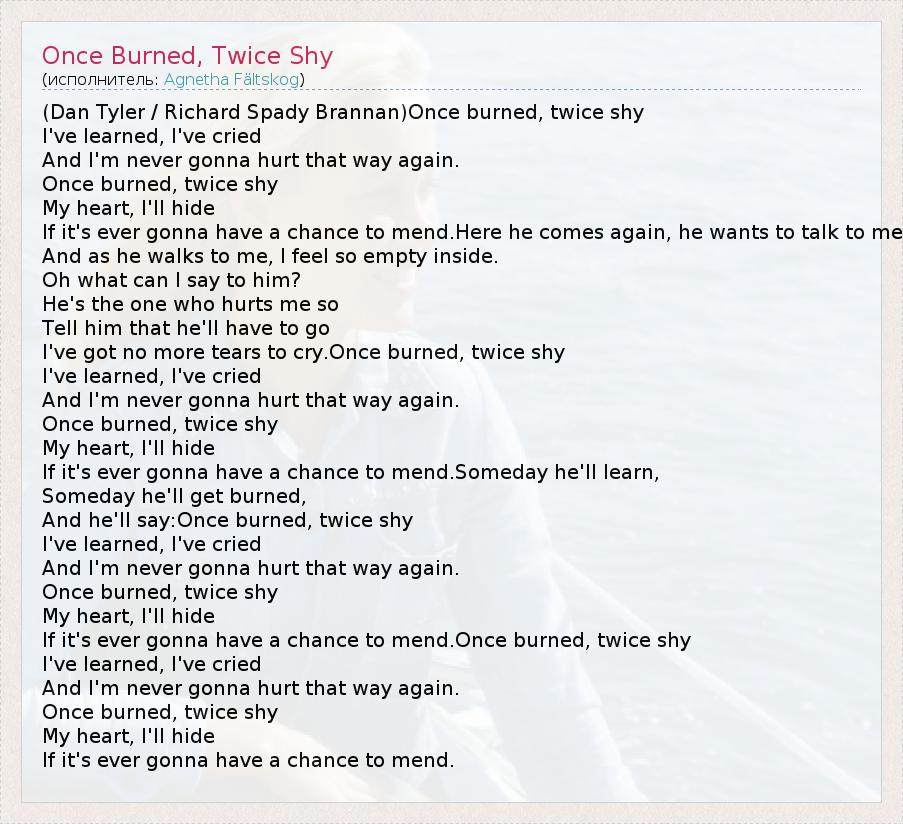 (Dan Tyler / Richard Spady Brannan)Once burned, twice shy I've learned, I've cried And I'm never gonna hurt that way again. Once burned, twice shy My heart, I'll hide If it's ever gonna have a chance to mend.Here he comes again, he wants to talk to me And as he walks to me, I feel so empty inside. Oh what can I say to him? He's the one who hurts me so Tell him that he'll have to go I've got no more tears to cry.Once burned, twice shy I've learned, I've cried And I'm never gonna hurt that way again. Once burned, twice shy My heart, I'll hide If it's ever gonna have a chance to mend.Someday he'll learn, Someday he'll get burned, And he'll say:Once burned, twice shy I've learned, I've cried And I'm never gonna hurt that way again. Once burned, twice shy My heart, I'll hide If it's ever gonna have a chance to mend.Once burned, twice shy I've learned, I've cried And I'm never gonna hurt that way again. Once burned, twice shy My heart, I'll hide If it's ever gonna have a chance to mend.
