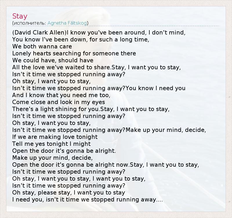 (David Clark Allen)I know you've been around, I don't mind, You know I've been down, for such a long time, We both wanna care Lonely hearts searching for someone there We could have, should have All the love we've waited to share.Stay, I want you to stay, Isn't it time we stopped running away? Oh stay, I want you to stay, Isn't it time we stopped running away?You know I need you And I know that you need me too, Come close and look in my eyes There's a light shining for you.Stay, I want you to stay, Isn't it time we stopped running away? Oh stay, I want you to stay, Isn't it time we stopped running away?Make up your mind, decide, If we are making love tonight Tell me yes tonight I might Open the door it's gonna be alright. Make up your mind, decide, Open the door it's gonna be alright now.Stay, I want you to stay, Isn't it time we stopped running away? Oh stay, I want you to stay, I want you to stay, Isn't it time we stopped running away? Oh stay, please stay, I want you to stay I need you, isn't it time we stopped running away....