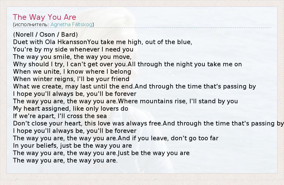 (Norell / Oson / Bard) Duet with Ola HkanssonYou take me high, out of the blue, You're by my side whenever I need you The way you smile, the way you move, Why should I try, I can't get over you.All through the night you take me on When we unite, I know where I belong When winter reigns, I'll be your friend What we create, may last until the end.And through the time that's passing by I hope you'll always be, you'll be forever The way you are, the way you are.Where mountains rise, I'll stand by you My heart assigned, like only lovers do If we're apart, I'll cross the sea Don't close your heart, this love was always free.And through the time that's passing by I hope you'll always be, you'll be forever The way you are, the way you are.And if you leave, don't go too far In your beliefs, just be the way you are The way you are, the way you are.Just be the way you are The way you are, the way you are.