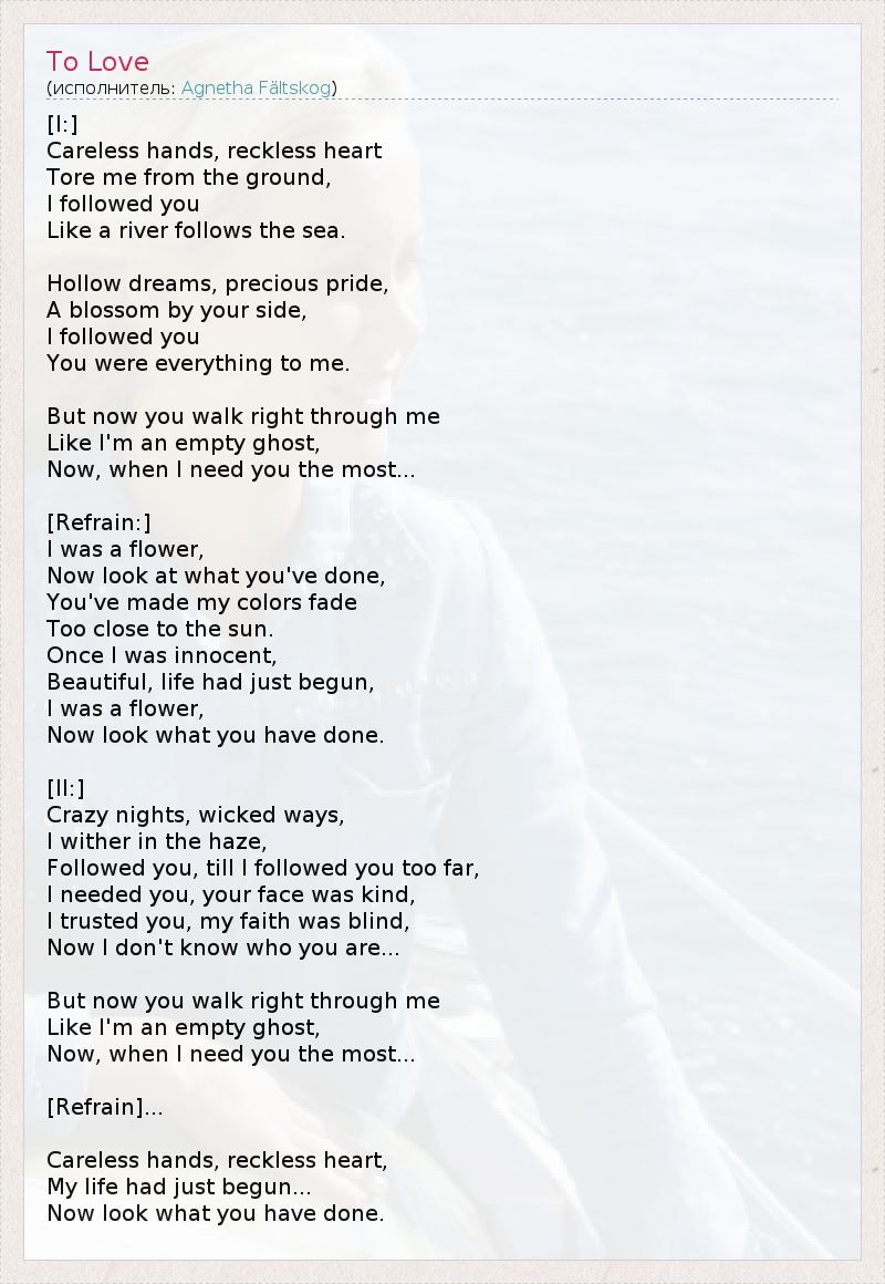 [I:] Беспечные руки, безрассудное сердце Сорвали меня с земли, Я следовала за тобой, Как река следует к морю. Наивные мечты, драгоценная гордость, Свежий цвет рядом с тобой, Я следовала за тобой, Ты был для меня всем. Но теперь ты проходишь мимо меня, Будто я - пустой призрак, Теперь, когда ты больше всего мне нужен... [Припев:] Я была цветком, А сейчас посмотри, что ты сделал, Из-за тебя мой цвет меркнет, Слишком близко к солнцу. Однажды я была невинна, Красива, и жизнь только начиналась, Я была цветком, А сейчас посмотри, что ты сделал. [II:] Сумасшедшие ночи, грешные пути, Я увядаю в тёмной дымке, Я следовала за тобой, пока не зашла слишком далеко, Ты был мне нужен, твоё лицо было ласковым, Я доверяла тебе, моя надежда была слепа. Теперь я не знаю, кто ты такой.... Но теперь ты проходишь мимо меня, Будто я - пустой призрак, Теперь, когда ты больше всего мне нужен... [Припев]... Беспечные руки, безрассудное сердце, Моя жизнь только начиналась... А теперь посмотри, что ты сделал.