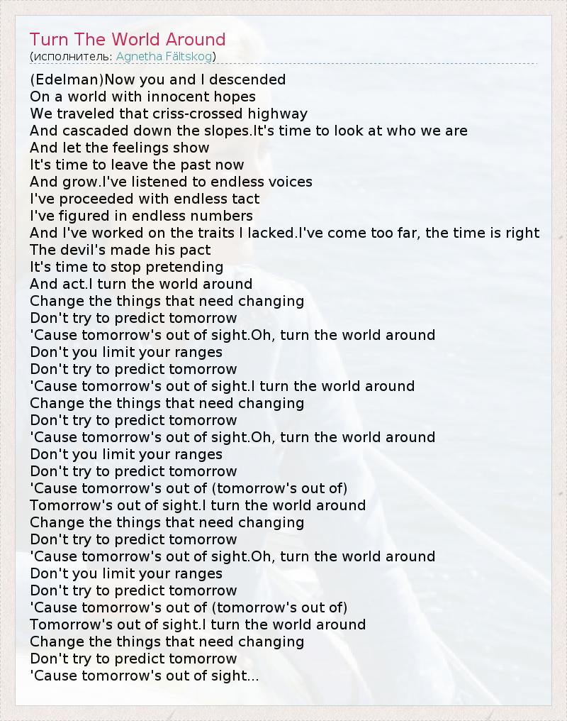 А как ты думаешь, о чем песня "Turn The World Around" ?