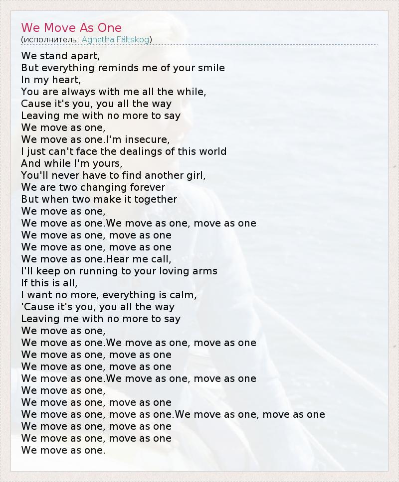 We stand apart, But everything reminds me of your smile In my heart, You are always with me all the while, Cause it's you, you all the way Leaving me with no more to say We move as one, We move as one.I'm insecure, I just can't face the dealings of this world And while I'm yours, You'll never have to find another girl, We are two changing forever But when two make it together We move as one, We move as one.We move as one, move as one We move as one, move as one We move as one, move as one We move as one.Hear me call, I'll keep on running to your loving arms If this is all, I want no more, everything is calm, 'Cause it's you, you all the way Leaving me with no more to say We move as one, We move as one.We move as one, move as one We move as one, move as one We move as one, move as one We move as one.We move as one, move as one We move as one, We move as one, move as one We move as one, move as one.We move as one, move as one We move as one, move as one We move as one, move as one We move as one.