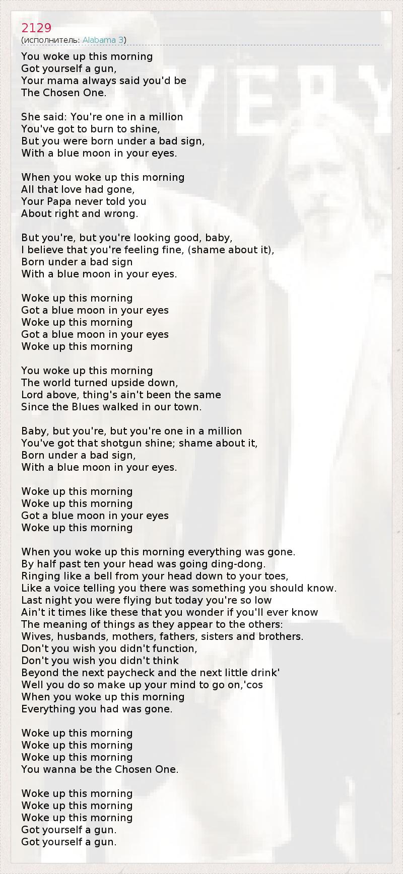 Это интересно:Alabama 3 (A3) – группа, играющая смесь рока, эсид хауса, блюза, кантри и госпела, основанная в пригороде Лондона - Брикстоне, в 1996 году. Своё название группа получила в память ”Алабама 2”, юридического случая на американском юге 30-ых годов, когда два афро-американца были повешены за предположительное изнасилование белой женщины. Это название – такое же поклонение другим жертвам несправедливости,... продолжение
