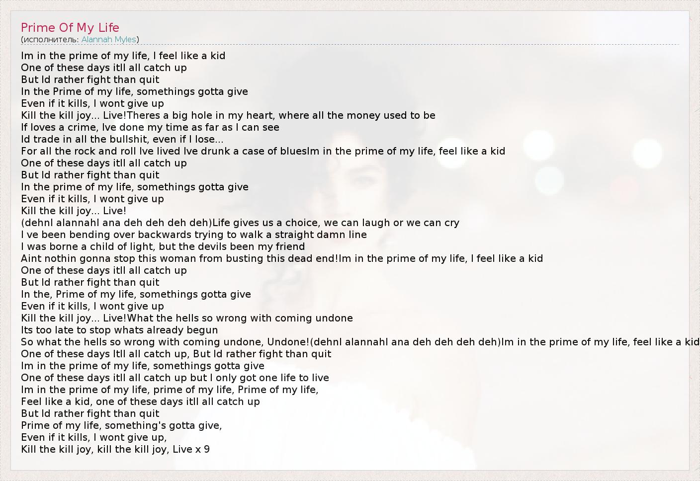 А как ты думаешь, о чем песня "Prime Of My Life" ?