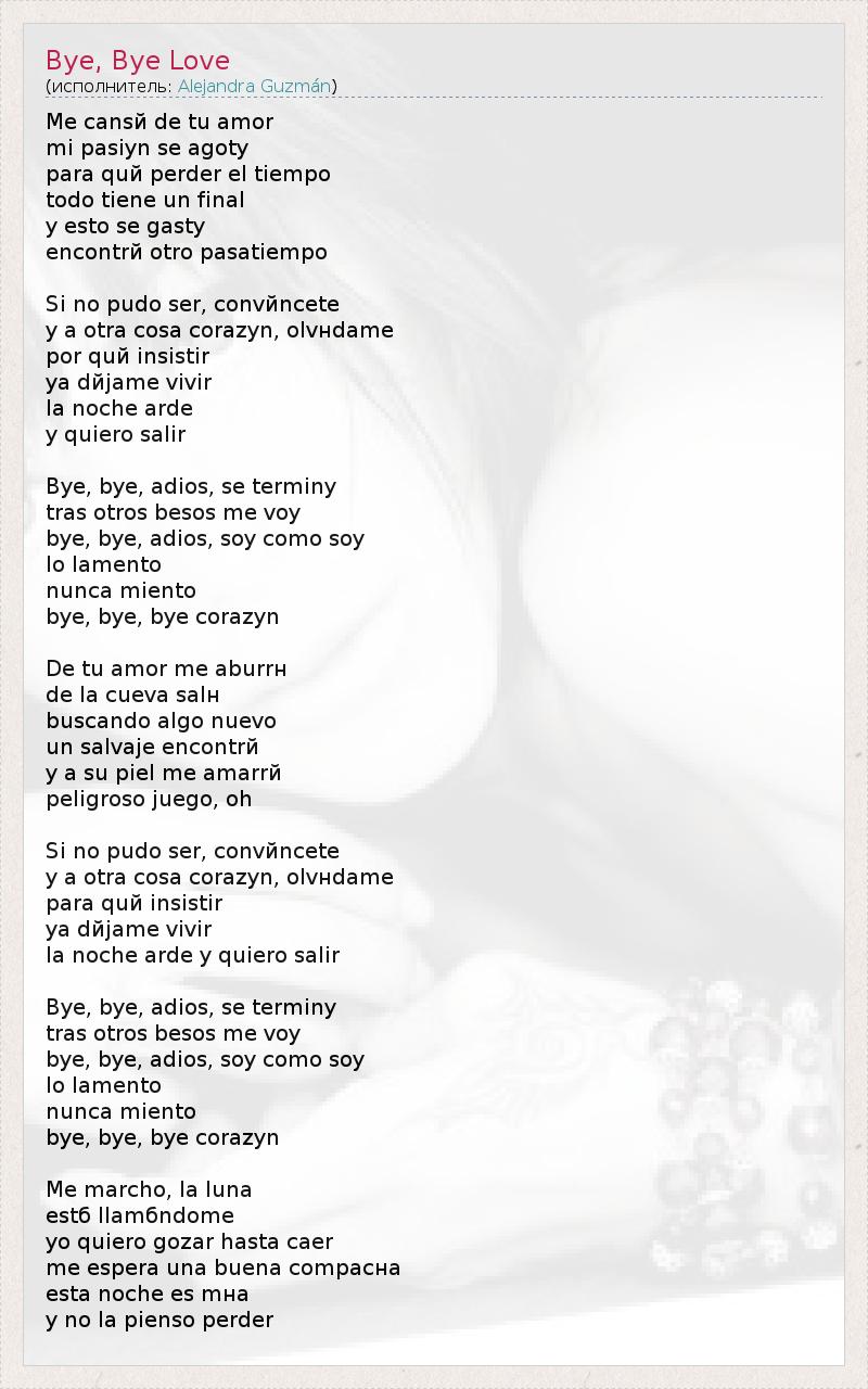 Me cansй de tu amor mi pasiуn se agotу para quй perder el tiempo todo tiene un final y esto se gastу encontrй otro pasatiempo Si no pudo ser, convйncete y a otra cosa corazуn, olvнdame por quй insistir ya dйjame vivir la noche arde y quiero salir Bye, bye, adios, se terminу tras otros besos me voy bye, bye, adios, soy como soy lo lamento nunca miento bye, bye, bye corazуn De tu amor me aburrн de la cueva salн buscando algo nuevo un salvaje encontrй y a su piel me amarrй peligroso juego, oh Si no pudo ser, convйncete y a otra cosa corazуn, olvнdame para quй insistir ya dйjame vivir la noche arde y quiero salir Bye, bye, adios, se terminу tras otros besos me voy bye, bye, adios, soy como soy lo lamento nunca miento bye, bye, bye corazуn Me marcho, la luna estб llamбndome yo quiero gozar hasta caer me espera una buena compaснa esta noche es mнa y no la pienso perder