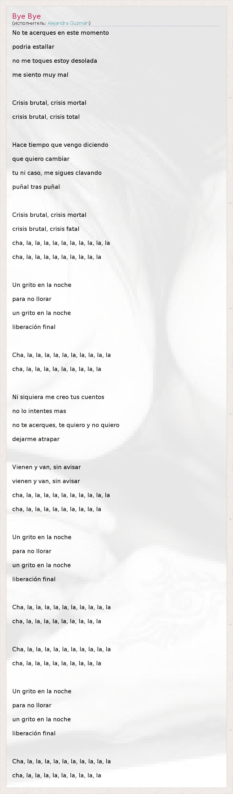 No te acerques en este momento podria estallar no me toques estoy desolada me siento muy mal Crisis brutal, crisis mortal crisis brutal, crisis total Hace tiempo que vengo diciendo que quiero cambiar tu ni caso, me sigues clavando puñal tras puñal Crisis brutal, crisis mortal crisis brutal, crisis fatal cha, la, la, la, la, la, la, la, la, la, la cha, la, la, la, la, la, la, la, la, la Un grito en la noche para no llorar un grito en la noche liberación final Cha, la, la, la, la, la, la, la, la, la, la cha, la, la, la, la, la, la, la, la, la Ni siquiera me creo tus cuentos no lo intentes mas no te acerques, te quiero y no quiero dejarme atrapar Vienen y van, sin avisar vienen y van, sin avisar cha, la, la, la, la, la, la, la, la, la, la cha, la, la, la, la, la, la, la, la, la Un grito en la noche para no llorar un grito en la noche liberación final Cha, la, la, la, la, la, la, la, la, la, la cha, la, la, la, la, la, la, la, la, la Cha, la, la, la, la, la, la, la, la, la, la cha, la, la, la, la, la, la, la, la, la Un grito en la noche para no llorar un grito en la noche liberación final Cha, la, la, la, la, la, la, la, la, la, la cha, la, la, la, la, la, la, la, la, la