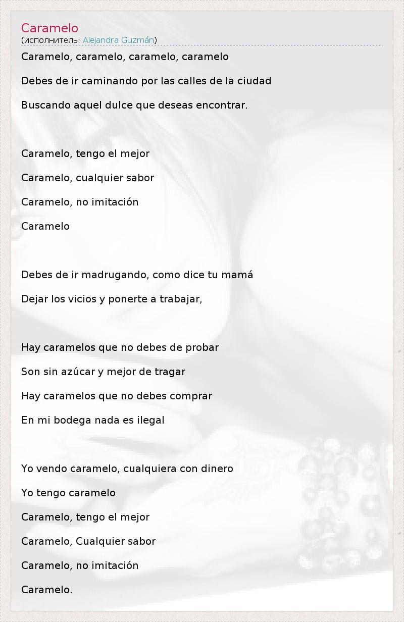 Caramelo, caramelo, caramelo, caramelo Debes de ir caminando por las calles de la ciudad Buscando aquel dulce que deseas encontrar. Caramelo, tengo el mejor Caramelo, cualquier sabor Caramelo, no imitación Caramelo Debes de ir madrugando, como dice tu mamá Dejar los vicios y ponerte a trabajar, Hay caramelos que no debes de probar Son sin azúcar y mejor de tragar Hay caramelos que no debes comprar En mi bodega nada es ilegal Yo vendo caramelo, cualquiera con dinero Yo tengo caramelo Caramelo, tengo el mejor Caramelo, Cualquier sabor Caramelo, no imitación Caramelo.