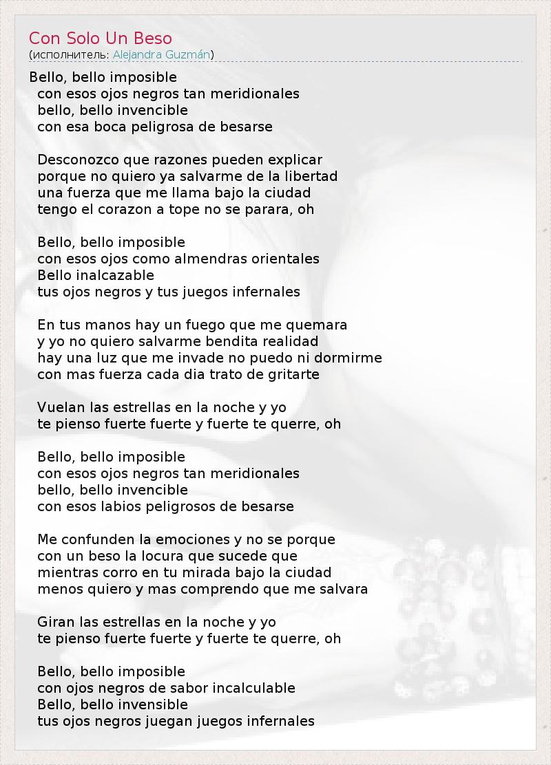 Bello, bello imposible con esos ojos negros tan meridionales bello, bello invencible con esa boca peligrosa de besarse Desconozco que razones pueden explicar porque no quiero ya salvarme de la libertad una fuerza que me llama bajo la ciudad tengo el corazon a tope no se parara, oh Bello, bello imposible con esos ojos como almendras orientales Bello inalcazable tus ojos negros y tus juegos infernales En tus manos hay un fuego que me quemara y yo no quiero salvarme bendita realidad hay una luz que me invade no puedo ni dormirme con mas fuerza cada dia trato de gritarte Vuelan las estrellas en la noche y yo te pienso fuerte fuerte y fuerte te querre, oh Bello, bello imposible con esos ojos negros tan meridionales bello, bello invencible con esos labios peligrosos de besarse Me confunden la emociones y no se porque con un beso la locura que sucede que mientras corro en tu mirada bajo la ciudad menos quiero y mas comprendo que me salvara Giran las estrellas en la noche y yo te pienso fuerte fuerte y fuerte te querre, oh Bello, bello imposible con ojos negros de sabor incalculable Bello, bello invensible tus ojos negros juegan juegos infernales