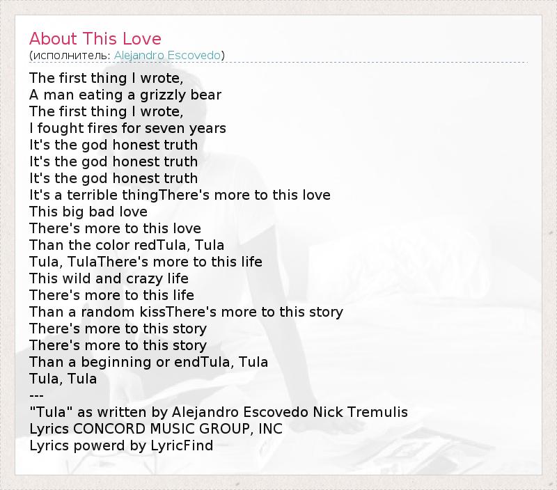 The first thing I wrote, A man eating a grizzly bear The first thing I wrote, I fought fires for seven years It's the god honest truth It's the god honest truth It's the god honest truth It's a terrible thingThere's more to this love This big bad love There's more to this love Than the color redTula, Tula Tula, TulaThere's more to this life This wild and crazy life There's more to this life Than a random kissThere's more to this story There's more to this story There's more to this story Than a beginning or endTula, Tula Tula, Tula --- "Tula" as written by Alejandro Escovedo Nick Tremulis Lyrics CONCORD MUSIC GROUP, INC Lyrics powerd by LyricFind