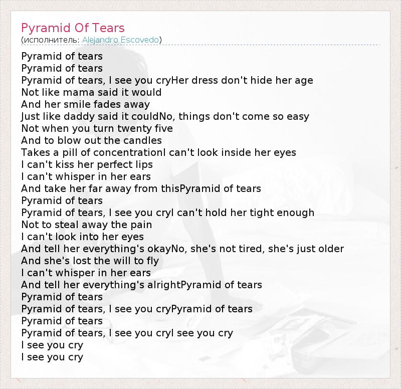 Pyramid of tears Pyramid of tears Pyramid of tears, I see you cryHer dress don't hide her age Not like mama said it would And her smile fades away Just like daddy said it couldNo, things don't come so easy Not when you turn twenty five And to blow out the candles Takes a pill of concentrationI can't look inside her eyes I can't kiss her perfect lips I can't whisper in her ears And take her far away from thisPyramid of tears Pyramid of tears Pyramid of tears, I see you cryI can't hold her tight enough Not to steal away the pain I can't look into her eyes And tell her everything's okayNo, she's not tired, she's just older And she's lost the will to fly I can't whisper in her ears And tell her everything's alrightPyramid of tears Pyramid of tears Pyramid of tears, I see you cryPyramid of tears Pyramid of tears Pyramid of tears, I see you cryI see you cry I see you cry I see you cry