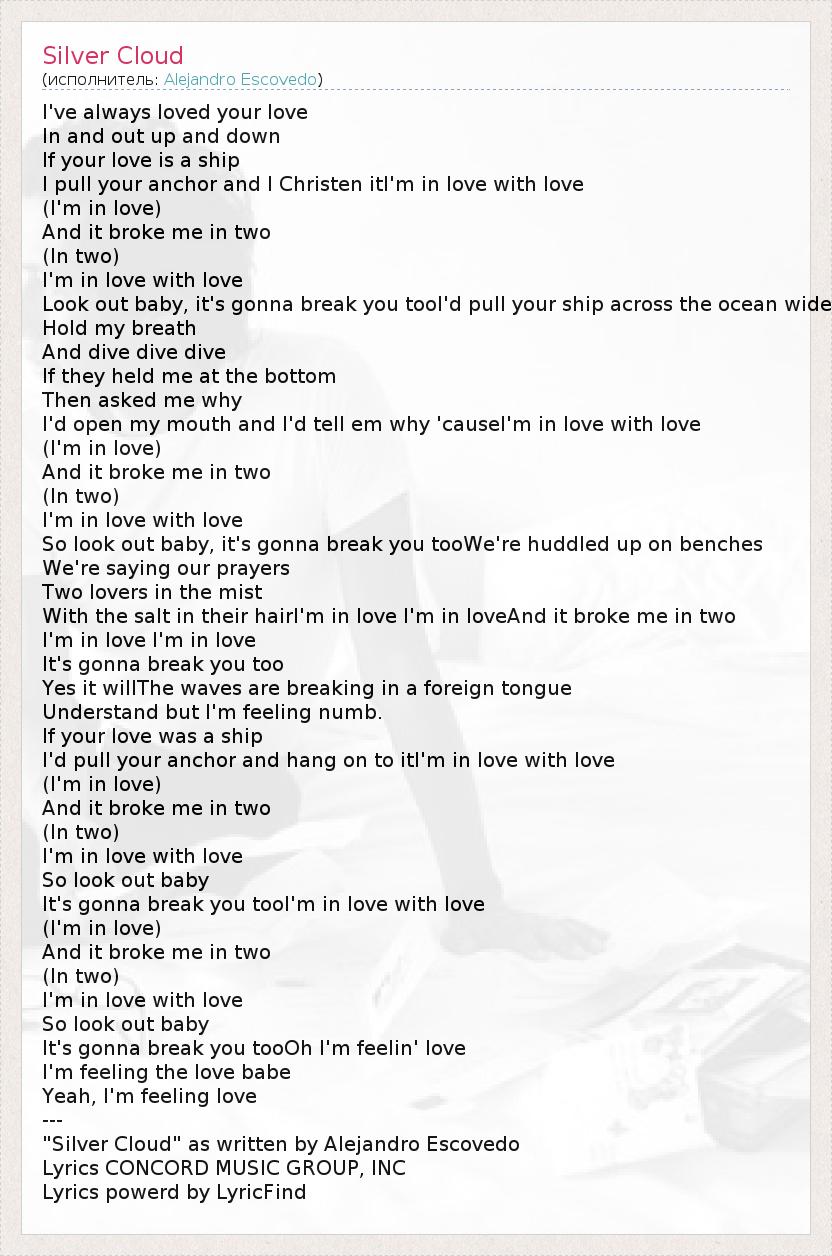 I've always loved your love In and out up and down If your love is a ship I pull your anchor and I Christen itI'm in love with love (I'm in love) And it broke me in two (In two) I'm in love with love Look out baby, it's gonna break you tooI'd pull your ship across the ocean wide Hold my breath And dive dive dive If they held me at the bottom Then asked me why I'd open my mouth and I'd tell em why 'causeI'm in love with love (I'm in love) And it broke me in two (In two) I'm in love with love So look out baby, it's gonna break you tooWe're huddled up on benches We're saying our prayers Two lovers in the mist With the salt in their hairI'm in love I'm in loveAnd it broke me in two I'm in love I'm in love It's gonna break you too Yes it willThe waves are breaking in a foreign tongue Understand but I'm feeling numb. If your love was a ship I'd pull your anchor and hang on to itI'm in love with love (I'm in love) And it broke me in two (In two) I'm in love with love So look out baby It's gonna break you tooI'm in love with love (I'm in love) And it broke me in two (In two) I'm in love with love So look out baby It's gonna break you tooOh I'm feelin' love I'm feeling the love babe Yeah, I'm feeling love --- "Silver Cloud" as written by Alejandro Escovedo Lyrics CONCORD MUSIC GROUP, INC Lyrics powerd by LyricFind