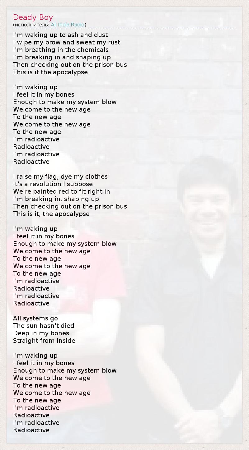 Я пробуждаюсь среди пепла и пыли, Вытираю ржавчину, что проступает пóтом. Каждый вдох полон химикатов, Я разрушаюсь и формируюсь снова, Затем расплачиваюсь и выхожу из тюремного автобуса. Вот и всё, это апокалипсис. Это пробуждение, Ощущаю его каждой частичкой тела. Этого чувства достаточно, чтобы снесло крышу. Добро пожаловать в новую эру, В новую эру! Добро пожаловать в новую эру, В новую эру! Я - радиоактивен, Радиоактивен. Я - радиоактивен, Радиоактивен. Я поднимаю свое знамя, переодеваюсь в одежду другого цвета. 1 Полагаю, что это - революция. Чтобы соответствовать ей, мы окрасились в красное. Я разрушаюсь и формируюсь снова, Затем расплачиваюсь и выхожу из тюремного автобуса. Вот и все, это апокалипсис. Это пробуждение, Ощущаю его каждой частичкой тела. Этого чувства достаточно, чтобы снесло крышу. Добро пожаловать в новую эру, В новую эру! Добро пожаловать в новую эру, В новую эру! Я - радиоактивен, Радиоактивен. Я - радиоактивен, Радиоактивен. Все системы в норме, Солнце не погасло. Оно глубоко внутри, Прямо во мне... Это пробуждение, Ощущаю его каждой частичкой тела. Этого чувства достаточно, чтобы снесло крышу. Добро пожаловать в новую эру, В новую эру! Добро пожаловать в новую эру, В новую эру! Я - радиоактивен, Радиоактивен. Я - радиоактивен, Радиоактивен. 1 - буквально: перекрашиваю свою одежду
