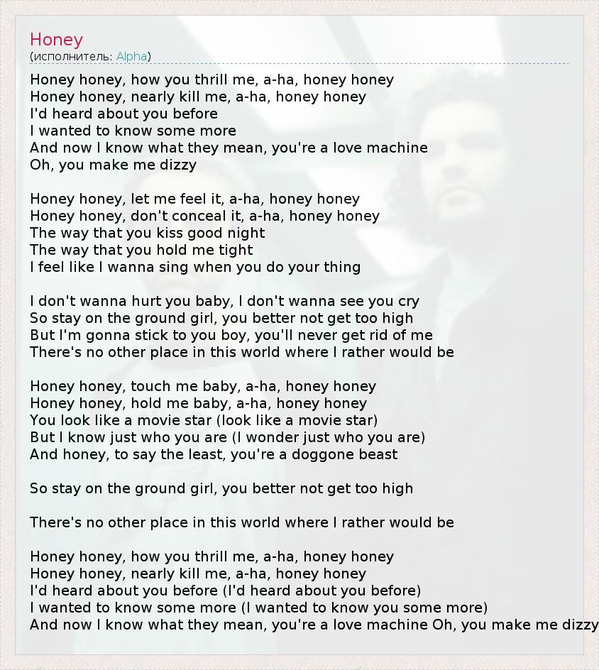 Honey honey, how you thrill me, a-ha, honey honey Honey honey, nearly kill me, a-ha, honey honey I'd heard about you before I wanted to know some more And now I know what they mean, you're a love machine Oh, you make me dizzy Honey honey, let me feel it, a-ha, honey honey Honey honey, don't conceal it, a-ha, honey honey The way that you kiss good night The way that you hold me tight I feel like I wanna sing when you do your thing I don't wanna hurt you baby, I don't wanna see you cry So stay on the ground girl, you better not get too high But I'm gonna stick to you boy, you'll never get rid of me There's no other place in this world where I rather would be Honey honey, touch me baby, a-ha, honey honey Honey honey, hold me baby, a-ha, honey honey You look like a movie star (look like a movie star) But I know just who you are (I wonder just who you are) And honey, to say the least, you're a doggone beast So stay on the ground girl, you better not get too high There's no other place in this world where I rather would be Honey honey, how you thrill me, a-ha, honey honey Honey honey, nearly kill me, a-ha, honey honey I'd heard about you before (I'd heard about you before) I wanted to know some more (I wanted to know you some more) And now I know what they mean, you're a love machine Oh, you make me dizzy