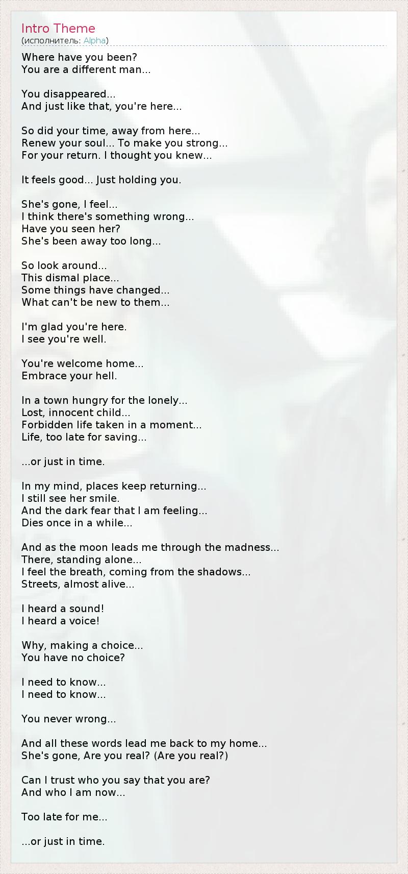 Где ты пропадал? Ты стал другим человеком... Ты внезапно исчез... И так же внезапно появился здесь... Время, проведенное далеко отсюда... Обновило твою душу... Чтобы сделать тебя сильнее... Для твоего возвращения. Я думаю, ты знаешь... Это хорошо... Дай мне обнять тебя. Она ушла, я чувствую... Я думаю с ней что-то не так... Не видел ли ты ее? Ее не было слишком долго... Оглянись... Это гнетущее место... Что-то изменилось... Что-то осталось прежним... Я рада, что ты здесь. Я вижу, ты в порядке. Добро пожаловать домой... Прими свой ад. В городе, изголодавшемся по одинокому, Потерянном, невинному младенцу... Запретная жизнь забирается в мгновенье, Жизнь, которую поздно спасать... ...или как раз вовремя. В моей голове все возвращается, Я все еще вижу ее улыбку, И темный страх, который я испытываю... Затихает на время... И луна сопровождает меня через безумие, Там, стоя в одиночестве... Я чувствую дыхание, приходящее из теней Улиц, едва живых... Я слышу звук! Я слышу голос! Почему, делая выбор... У тебя нет выбора? Мне нужно знать... Мне нужно знать... Ты всегда прав... Все эти слова уносят меня назад, к моему дому... Она ушла, а ты все еще тут? Это правда ты? Могу ли я поверить в то, что это ты? И кто я сейчас... Слишком поздно для меня... ...или как раз вовремя.