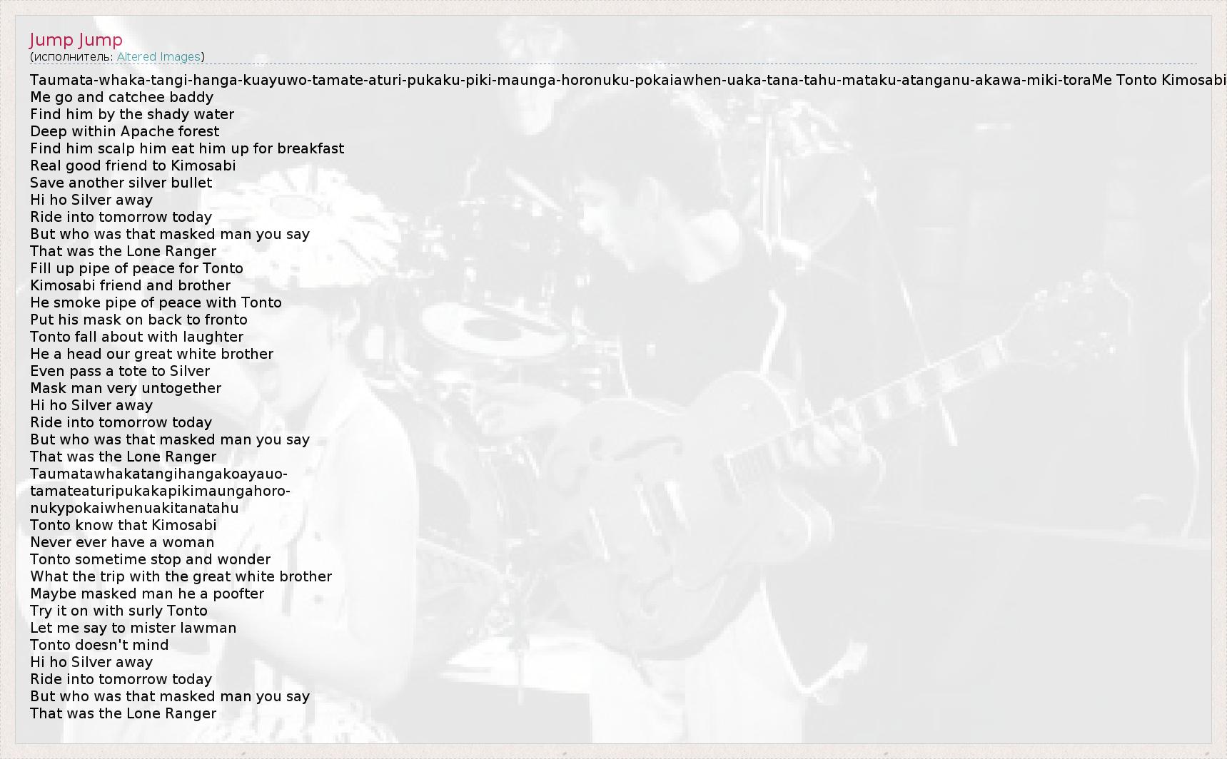 Taumata-whaka-tangi-hanga-kuayuwo-tamate-aturi-pukaku-piki-maunga-horonuku-pokaiawhen-uaka-tana-tahu-mataku-atanganu-akawa-miki-toraMe Tonto Kimosabi Me go and catchee baddy Find him by the shady water Deep within Apache forest Find him scalp him eat him up for breakfast Real good friend to Kimosabi Save another silver bullet Hi ho Silver away Ride into tomorrow today But who was that masked man you say That was the Lone Ranger Fill up pipe of peace for Tonto Kimosabi friend and brother He smoke pipe of peace with Tonto Put his mask on back to fronto Tonto fall about with laughter He a head our great white brother Even pass a tote to Silver Mask man very untogether Hi ho Silver away Ride into tomorrow today But who was that masked man you say That was the Lone Ranger Taumatawhakatangihangakoayauo- tamateaturipukakapikimaungahoro- nukypokaiwhenuakitanatahu Tonto know that Kimosabi Never ever have a woman Tonto sometime stop and wonder What the trip with the great white brother Maybe masked man he a poofter Try it on with surly Tonto Let me say to mister lawman Tonto doesn't mind Hi ho Silver away Ride into tomorrow today But who was that masked man you say That was the Lone Ranger