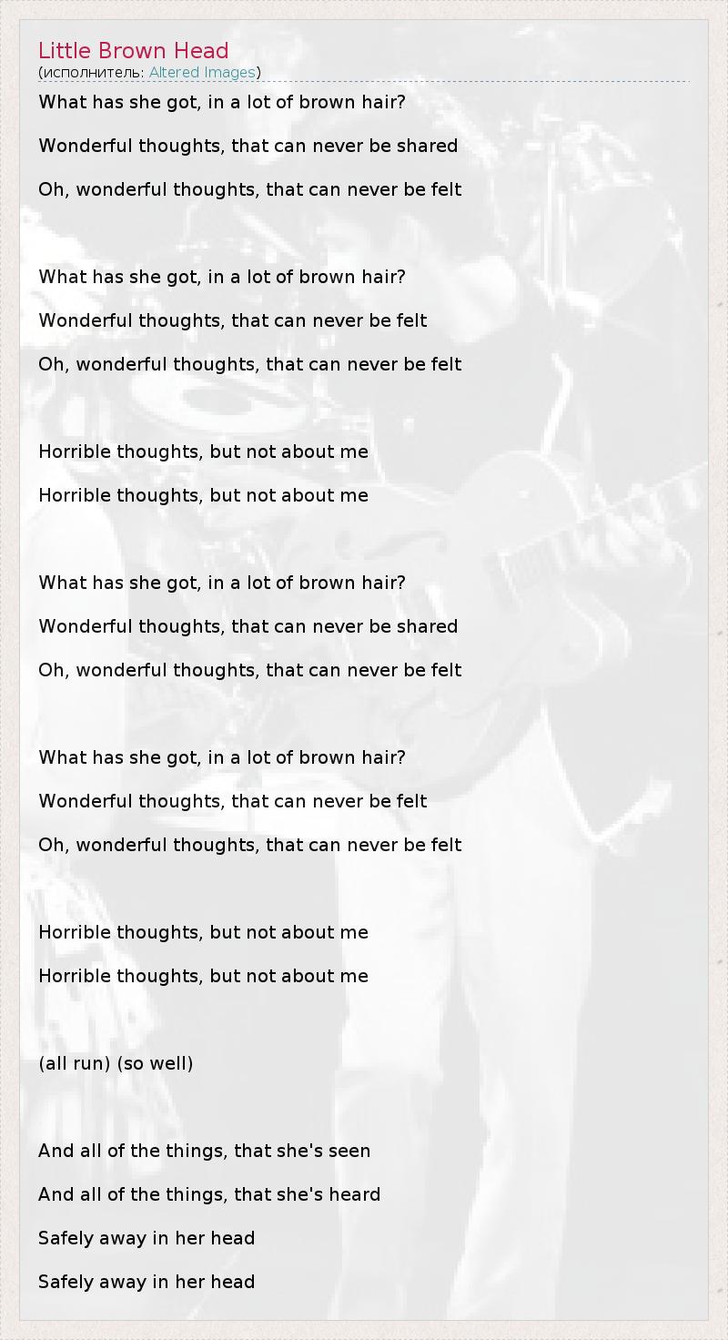 What has she got, in a lot of brown hair? Wonderful thoughts, that can never be shared Oh, wonderful thoughts, that can never be felt What has she got, in a lot of brown hair? Wonderful thoughts, that can never be felt Oh, wonderful thoughts, that can never be felt Horrible thoughts, but not about me Horrible thoughts, but not about me What has she got, in a lot of brown hair? Wonderful thoughts, that can never be shared Oh, wonderful thoughts, that can never be felt What has she got, in a lot of brown hair? Wonderful thoughts, that can never be felt Oh, wonderful thoughts, that can never be felt Horrible thoughts, but not about me Horrible thoughts, but not about me (all run) (so well) And all of the things, that she's seen And all of the things, that she's heard Safely away in her head Safely away in her head