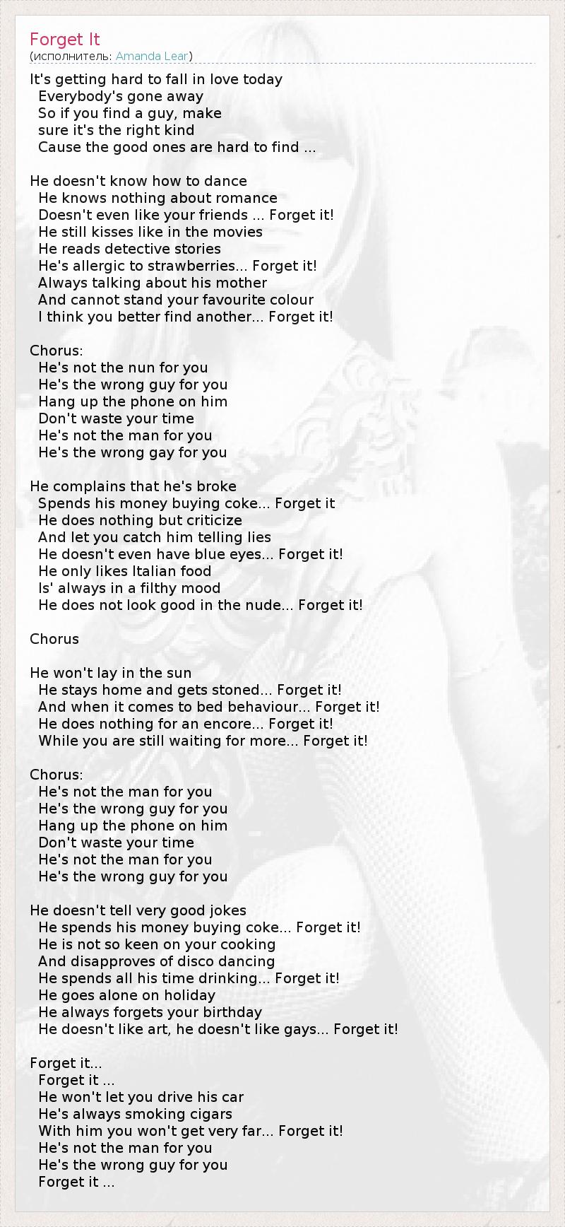 It's getting hard to fall in love today Everybody's gone away So if you find a guy, make sure it's the right kind Cause the good ones are hard to find ... He doesn't know how to dance He knows nothing about romance Doesn't even like your friends ... Forget it! He still kisses like in the movies He reads detective stories He's allergic to strawberries... Forget it! Always talking about his mother And cannot stand your favourite colour I think you better find another... Forget it! Chorus: He's not the nun for you He's the wrong guy for you Hang up the phone on him Don't waste your time He's not the man for you He's the wrong gay for you He complains that he's broke Spends his money buying coke... Forget it He does nothing but criticize And let you catch him telling lies He doesn't even have blue eyes... Forget it! He only likes Italian food Is' always in a filthy mood He does not look good in the nude... Forget it! Chorus He won't lay in the sun He stays home and gets stoned... Forget it! And when it comes to bed behaviour... Forget it! He does nothing for an encore... Forget it! While you are still waiting for more... Forget it! Chorus: He's not the man for you He's the wrong guy for you Hang up the phone on him Don't waste your time He's not the man for you He's the wrong guy for you He doesn't tell very good jokes He spends his money buying coke... Forget it! He is not so keen on your cooking And disapproves of disco dancing He spends all his time drinking... Forget it! He goes alone on holiday He always forgets your birthday He doesn't like art, he doesn't like gays... Forget it! Forget it... Forget it ... He won't let you drive his car He's always smoking cigars With him you won't get very far... Forget it! He's not the man for you He's the wrong guy for you Forget it ...