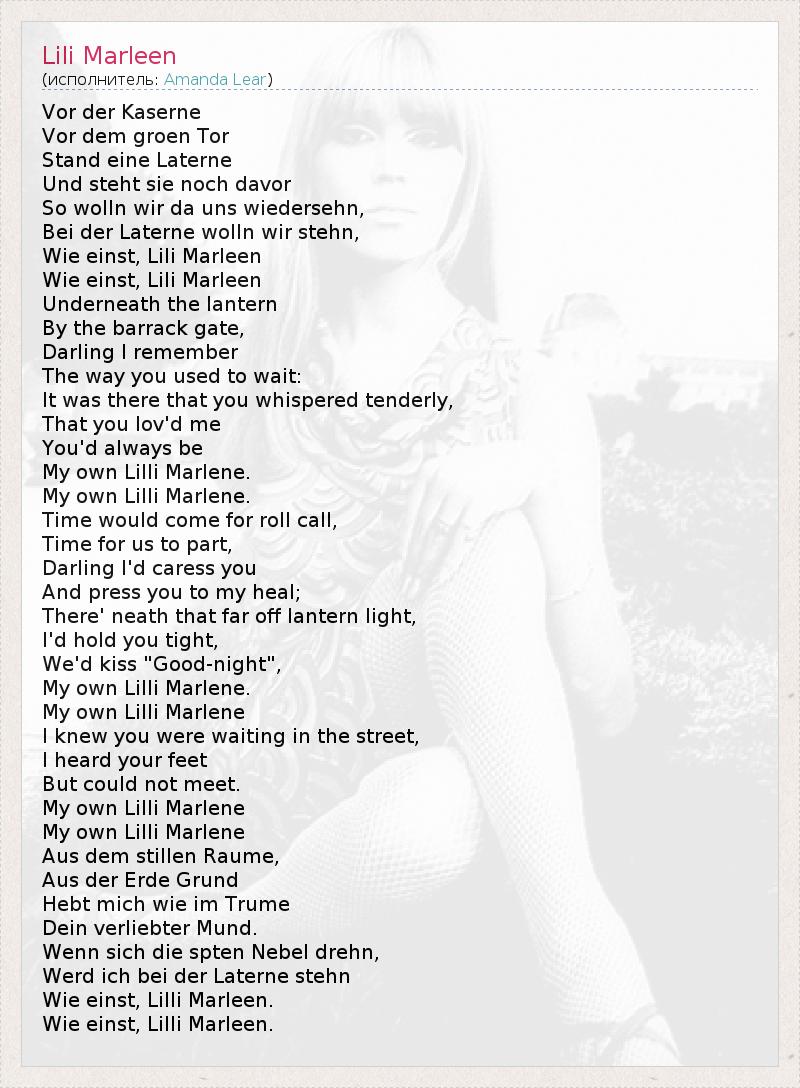 Vor der Kaserne Vor dem groen Tor Stand eine Laterne Und steht sie noch davor So wolln wir da uns wiedersehn, Bei der Laterne wolln wir stehn, Wie einst, Lili Marleen Wie einst, Lili Marleen Underneath the lantern By the barrack gate, Darling I remember The way you used to wait: It was there that you whispered tenderly, That you lov'd me You'd always be My own Lilli Marlene. My own Lilli Marlene. Time would come for roll call, Time for us to part, Darling I'd caress you And press you to my heal; There' neath that far off lantern light, I'd hold you tight, We'd kiss "Good-night", My own Lilli Marlene. My own Lilli Marlene I knew you were waiting in the street, I heard your feet But could not meet. My own Lilli Marlene My own Lilli Marlene Aus dem stillen Raume, Aus der Erde Grund Hebt mich wie im Trume Dein verliebter Mund. Wenn sich die spten Nebel drehn, Werd ich bei der Laterne stehn Wie einst, Lilli Marleen. Wie einst, Lilli Marleen.