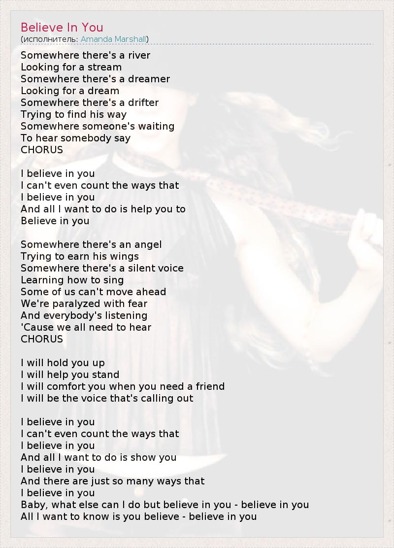 Somewhere there's a river Looking for a stream Somewhere there's a dreamer Looking for a dream Somewhere there's a drifter Trying to find his way Somewhere someone's waiting To hear somebody say CHORUS I believe in you I can't even count the ways that I believe in you And all I want to do is help you to Believe in you Somewhere there's an angel Trying to earn his wings Somewhere there's a silent voice Learning how to sing Some of us can't move ahead We're paralyzed with fear And everybody's listening 'Cause we all need to hear CHORUS I will hold you up I will help you stand I will comfort you when you need a friend I will be the voice that's calling out I believe in you I can't even count the ways that I believe in you And all I want to do is show you I believe in you And there are just so many ways that I believe in you Baby, what else can I do but believe in you - believe in you All I want to know is you believe - believe in you