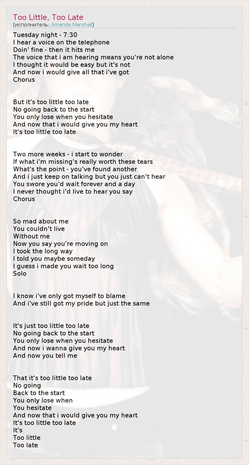 А как ты думаешь, о чем песня "Too Little, Too Late" ?