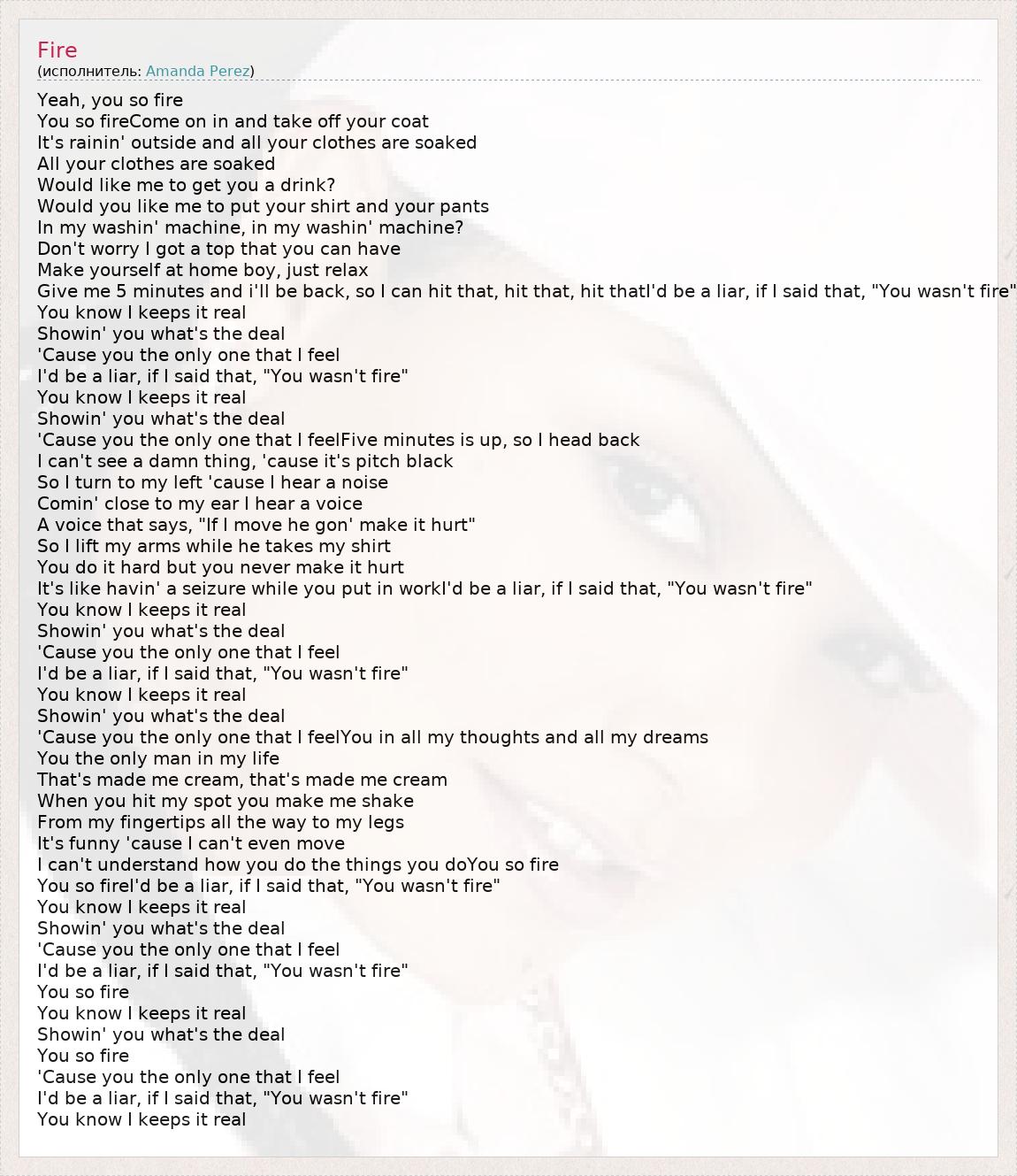 Yeah, you so fire You so fireCome on in and take off your coat It's rainin' outside and all your clothes are soaked All your clothes are soaked Would like me to get you a drink? Would you like me to put your shirt and your pants In my washin' machine, in my washin' machine? Don't worry I got a top that you can have Make yourself at home boy, just relax Give me 5 minutes and i'll be back, so I can hit that, hit that, hit thatI'd be a liar, if I said that, "You wasn't fire" You know I keeps it real Showin' you what's the deal 'Cause you the only one that I feel I'd be a liar, if I said that, "You wasn't fire" You know I keeps it real Showin' you what's the deal 'Cause you the only one that I feelFive minutes is up, so I head back I can't see a damn thing, 'cause it's pitch black So I turn to my left 'cause I hear a noise Comin' close to my ear I hear a voice A voice that says, "If I move he gon' make it hurt" So I lift my arms while he takes my shirt You do it hard but you never make it hurt It's like havin' a seizure while you put in workI'd be a liar, if I said that, "You wasn't fire" You know I keeps it real Showin' you what's the deal 'Cause you the only one that I feel I'd be a liar, if I said that, "You wasn't fire" You know I keeps it real Showin' you what's the deal 'Cause you the only one that I feelYou in all my thoughts and all my dreams You the only man in my life That's made me cream, that's made me cream When you hit my spot you make me shake From my fingertips all the way to my legs It's funny 'cause I can't even move I can't understand how you do the things you doYou so fire You so fireI'd be a liar, if I said that, "You wasn't fire" You know I keeps it real Showin' you what's the deal 'Cause you the only one that I feel I'd be a liar, if I said that, "You wasn't fire" You so fire You know I keeps it real Showin' you what's the deal You so fire 'Cause you the only one that I feel I'd be a liar, if I said that, "You wasn't fire" You know I keeps it real