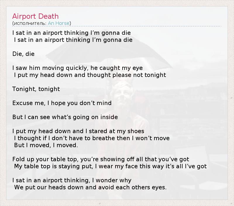 Я сидел в аэропорту мышления я умру Я сидел в аэропорту мышления я умру Умри, Я видел, как он движется быстро, он поймал мой глаз Я положил голову и думал , пожалуйста, не сегодня Сегодня , сегодня Простите, я надеюсь, вы не возражаете Но я вижу, что происходит внутри Я положил голову вниз, и я смотрел на мои туфли Я подумал, что если я не дышать , то я не буду двигаться Но я переехал , я переехал . Сложите свой столешницу , вы демонстрируя всем, что у вас есть Мой стол верх оставаться говоря, я ношу мое лицо это способ это все, что я получил Я сидел в аэропорту мышления , я удивляюсь, почему Мы ставим наши головы и избежать друг друга глаза .