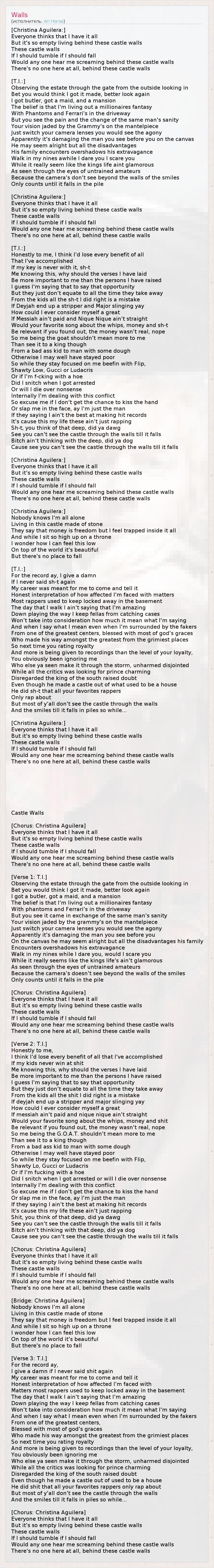[Christina Aguilera:] Everyone thinks that I have it all But it's so empty living behind these castle walls These castle walls If I should tumble if I should fall Would any one hear me screaming behind these castle walls There's no one here at all, behind these castle walls [T.I.:] Observing the estate through the gate from the outside looking in Bet you would think I got it made, better look again I got butler, got a maid, and a mansion The belief is that I'm living out a millionaires fantasy With Phantoms and Ferrari's in the driveway But you see the pain and the change of the same man's sanity Your vision jaded by the Grammy's on the mantelpiece Just switch your camera lenses you would see the agony Apparently it's damaging the man you see before you on the canvas He may seem alright but all the disadvantages His family encounters overshadows his extravagance Walk in my nines awhile I dare you I scare you While it really seem like the kings life aint glamorous As seen through the eyes of untrained amateurs Because the camera's don't see beyond the walls of the smiles Only counts until it falls in the pile [Christina Aguilera:] Everyone thinks that I have it all But it's so empty living behind these castle walls These castle walls If I should tumble if I should fall Would any one hear me screaming behind these castle walls There's no one here at all, behind these castle walls [T.I.:] Honestly to me, I think I'd lose every benefit of all That I've accomplished If my key is never with it, sh-t Me knowing this, why should the verses I have laid Be more important to me than the persons I have raised I guess I'm saying that to say that opportunity But they just don't equate to all the time they take away From the kids all the sh-t I did right is a mistake If Deyjah end up a stripper and Major slinging yay How could I ever consider myself a great If Messiah ain't paid and Nique Nique ain't straight Would your favorite song about the whips, money and sh-t Be relevant if you found out, the money wasn't real, nope So me being the goat shouldn't mean more to me Than see it to a king though From a bad ass kid to man with some dough Otherwise I may well have stayed poor So while they stay focused on me beefin with Flip, Shawty Low, Gucci or Ludacris Or if I'm f-cking with a hoe Did I snitch when I got arrested Or will I die over nonsense Internally I'm dealing with this conflict So excuse me if I don't get the chance to kiss the hand Or slap me in the face, ay I'm just the man If they saying I ain't the best at making hit records It's cause this my life these ain't just rapping Sh-t, you think of that deep, did ya dawg See you can't see the castle through the walls till it falls Bitch ain't thinking with the deep, did ya dog Cause see you can't see the castle through the walls till it falls [Christina Aguilera:] Everyone thinks that I have it all But it's so empty living behind these castle walls These castle walls If I should tumble if I should fall Would any one hear me screaming behind these castle walls There's no one here at all, behind these castle walls [Christina Aguilera:] Nobody knows I'm all alone Living in this castle made of stone They say that money is freedom but I feel trapped inside it all And while I sit so high up on a throne I wonder how I can feel this low On top of the world it's beautiful But there's no place to fall [T.I.:] For the record ay, I give a damn If I never said sh-t again My career was meant for me to come and tell it Honest interpretation of how affected I'm faced with matters Most rappers used to keep locked away in the basement The day that I walk I ain't saying that I'm amazing Down playing the way I keep fellas from catching cases Won't take into consideration how much it mean what I'm saying And when I say what I mean even when I'm surrounded by the fakers From one of the greatest centers, blessed with most of god's graces Who made his way amongst the greatest from the grimiest places So next time you rating royalty And more is being given to recordings than the level of your loyalty, You obviously been ignoring me Who else ya seen make it through the storm, unharmed disjointed While all the critics was looking for prince charming Disregarded the king of the south raised doubt Even though he made a castle out of what used to be a house He did sh-t that all your favorites rappers Only rap about But most of y'all don't see the castle through the walls And the smiles till it falls in piles so while... [Christina Aguilera:] Everyone thinks that I have it all But it's so empty living behind these castle walls These castle walls If I should tumble if I should fall Would any one hear me screaming behind these castle walls There's no one here at all, behind these castle walls Castle Walls [Chorus: Christina Aguilera] Everyone thinks that I have it all But it's so empty living behind these castle walls These castle walls If I should tumble if I should fall Would any one hear me screaming behind these castle walls There's no one here at all, behind these castle walls [Verse 1: T.I.] Observing the estate through the gate from the outside looking in Bet you would think I got it made, better look again I got a butler, got a maid, and a mansion The belief is that I'm living out a millionaires fantasy With phantoms and Ferrari's in the driveway But you see it came in exchange of the same man's sanity Your vision jaded by the grammy's on the mantelpiece Just switch your camera lenses you would see the agony Apparently it's damaging the man you see before you On the canvas he may seem alright but all the disadvantages his family Encounters overshadows his extravagance Walk in my nines while I dare you, would I scare you While it really seems like the kings life's ain't glamorous As seen through the eyes of untrained amateurs Because the camera's doesn't see beyond the walls of the smiles Only counts until it falls in the pile [Chorus: Christina Aguilera] Everyone thinks tha