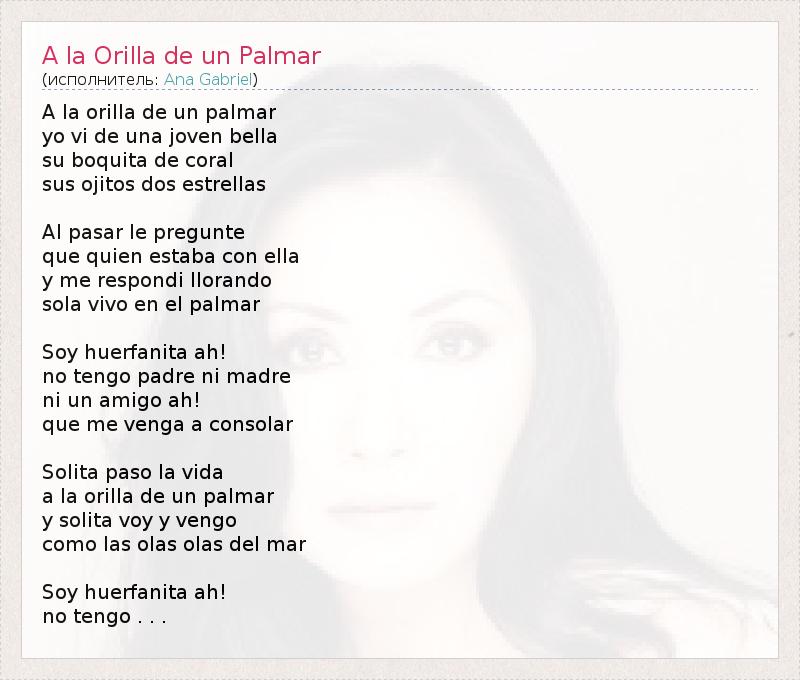 A la orilla de un palmar yo vi de una joven bella su boquita de coral sus ojitos dos estrellas Al pasar le pregunte que quien estaba con ella y me respondi llorando sola vivo en el palmar Soy huerfanita ah! no tengo padre ni madre ni un amigo ah! que me venga a consolar Solita paso la vida a la orilla de un palmar y solita voy y vengo como las olas olas del mar Soy huerfanita ah! no tengo . . .