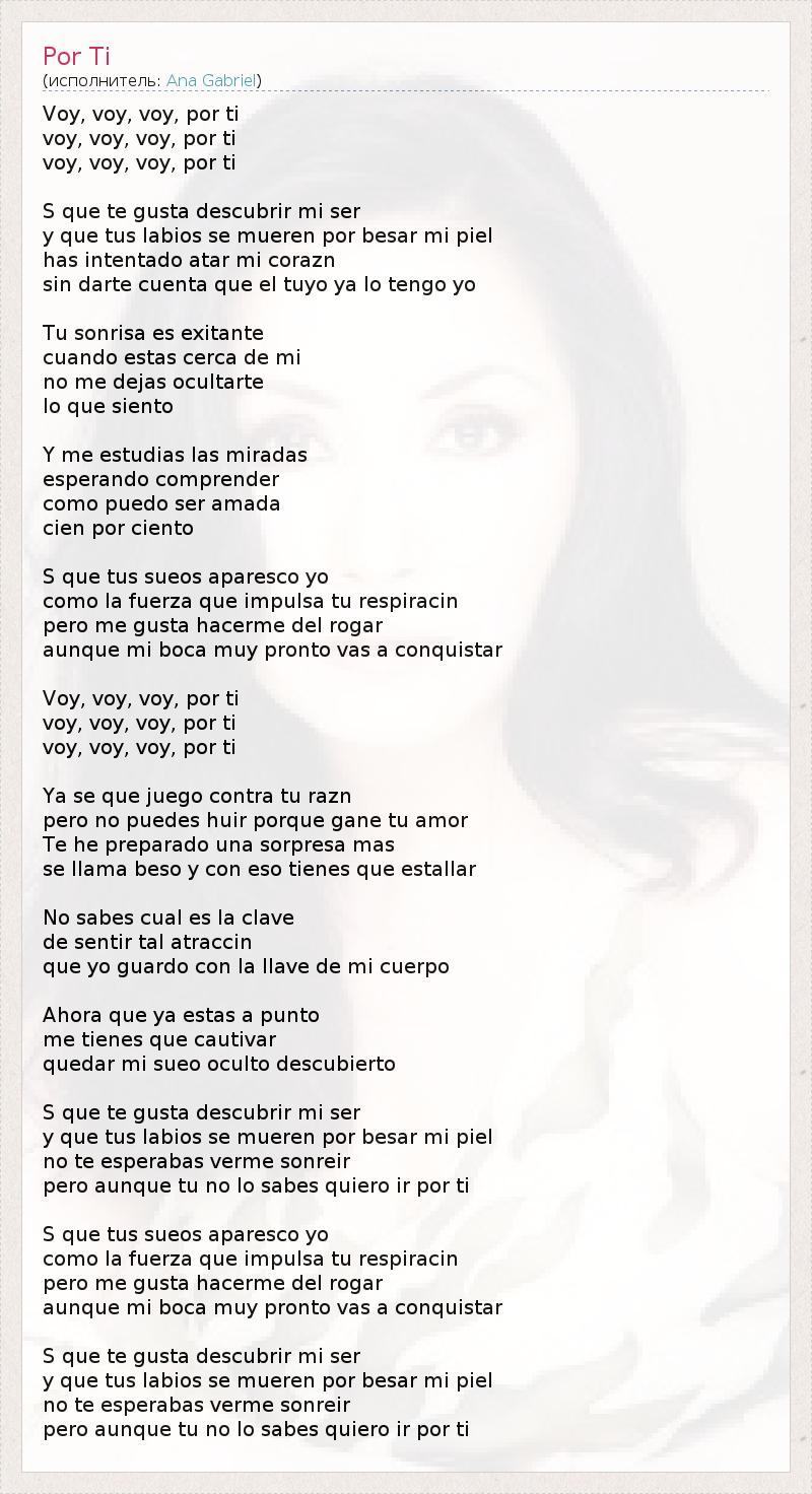 Voy, voy, voy, por ti voy, voy, voy, por ti voy, voy, voy, por ti S que te gusta descubrir mi ser y que tus labios se mueren por besar mi piel has intentado atar mi corazn sin darte cuenta que el tuyo ya lo tengo yo Tu sonrisa es exitante cuando estas cerca de mi no me dejas ocultarte lo que siento Y me estudias las miradas esperando comprender como puedo ser amada cien por ciento S que tus sueos aparesco yo como la fuerza que impulsa tu respiracin pero me gusta hacerme del rogar aunque mi boca muy pronto vas a conquistar Voy, voy, voy, por ti voy, voy, voy, por ti voy, voy, voy, por ti Ya se que juego contra tu razn pero no puedes huir porque gane tu amor Te he preparado una sorpresa mas se llama beso y con eso tienes que estallar No sabes cual es la clave de sentir tal atraccin que yo guardo con la llave de mi cuerpo Ahora que ya estas a punto me tienes que cautivar quedar mi sueo oculto descubierto S que te gusta descubrir mi ser y que tus labios se mueren por besar mi piel no te esperabas verme sonreir pero aunque tu no lo sabes quiero ir por ti S que tus sueos aparesco yo como la fuerza que impulsa tu respiracin pero me gusta hacerme del rogar aunque mi boca muy pronto vas a conquistar S que te gusta descubrir mi ser y que tus labios se mueren por besar mi piel no te esperabas verme sonreir pero aunque tu no lo sabes quiero ir por ti