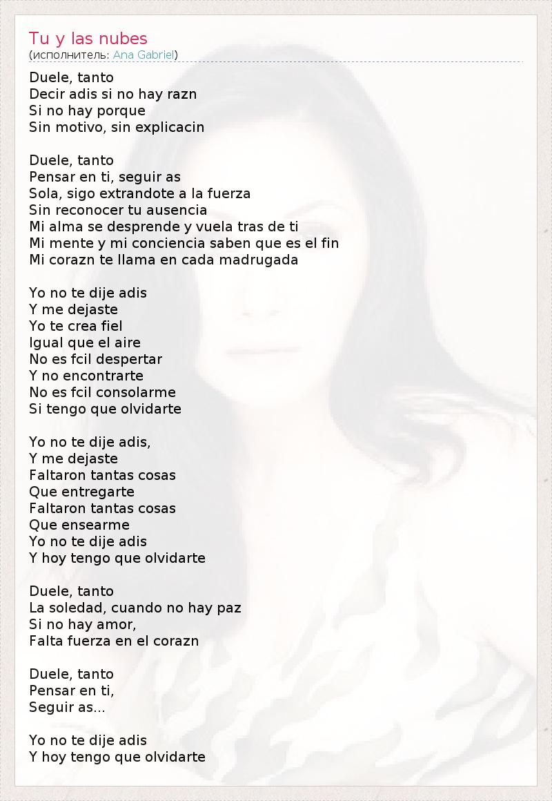 Duele, tanto Decir adis si no hay razn Si no hay porque Sin motivo, sin explicacin Duele, tanto Pensar en ti, seguir as Sola, sigo extrandote a la fuerza Sin reconocer tu ausencia Mi alma se desprende y vuela tras de ti Mi mente y mi conciencia saben que es el fin Mi corazn te llama en cada madrugada Yo no te dije adis Y me dejaste Yo te crea fiel Igual que el aire No es fcil despertar Y no encontrarte No es fcil consolarme Si tengo que olvidarte Yo no te dije adis, Y me dejaste Faltaron tantas cosas Que entregarte Faltaron tantas cosas Que ensearme Yo no te dije adis Y hoy tengo que olvidarte Duele, tanto La soledad, cuando no hay paz Si no hay amor, Falta fuerza en el corazn Duele, tanto Pensar en ti, Seguir as... Yo no te dije adis Y hoy tengo que olvidarte