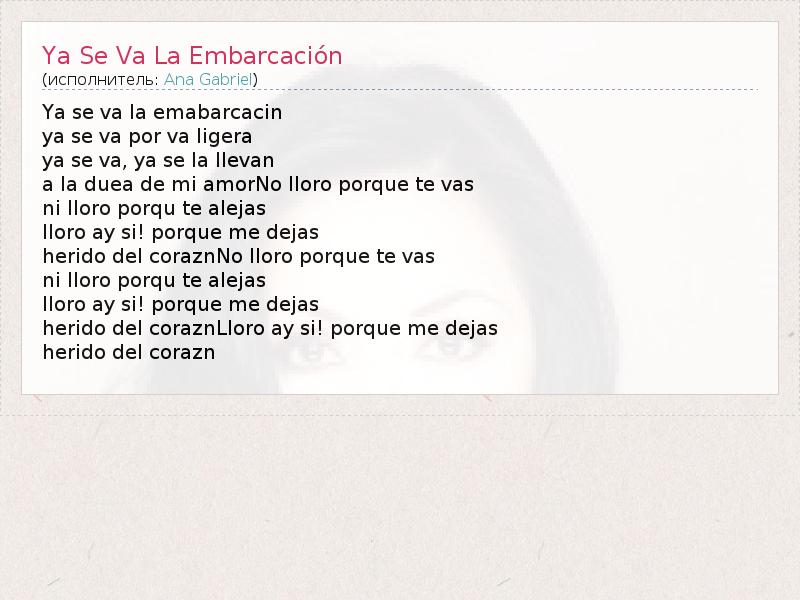 Ya se va la emabarcacin ya se va por va ligera ya se va, ya se la llevan a la duea de mi amorNo lloro porque te vas ni lloro porqu te alejas lloro ay si! porque me dejas herido del coraznNo lloro porque te vas ni lloro porqu te alejas lloro ay si! porque me dejas herido del coraznLloro ay si! porque me dejas herido del corazn