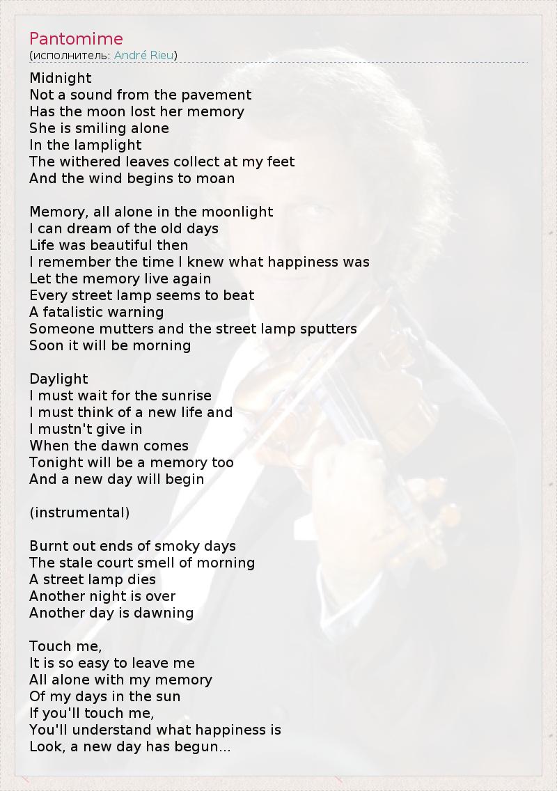 Midnight Not a sound from the pavement Has the moon lost her memory She is smiling alone In the lamplight The withered leaves collect at my feet And the wind begins to moan Memory, all alone in the moonlight I can dream of the old days Life was beautiful then I remember the time I knew what happiness was Let the memory live again Every street lamp seems to beat A fatalistic warning Someone mutters and the street lamp sputters Soon it will be morning Daylight I must wait for the sunrise I must think of a new life and I mustn't give in When the dawn comes Tonight will be a memory too And a new day will begin (instrumental) Burnt out ends of smoky days The stale court smell of morning A street lamp dies Another night is over Another day is dawning Touch me, It is so easy to leave me All alone with my memory Of my days in the sun If you'll touch me, You'll understand what happiness is Look, a new day has begun...