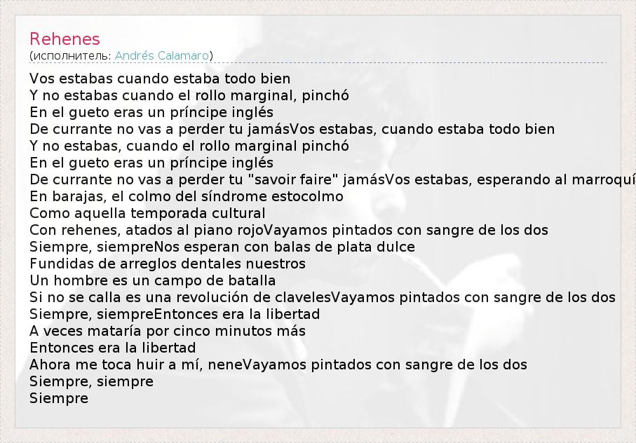 Vos estabas cuando estaba todo bien Y no estabas cuando el rollo marginal, pinchó En el gueto eras un príncipe inglés De currante no vas a perder tu jamásVos estabas, cuando estaba todo bien Y no estabas, cuando el rollo marginal pinchó En el gueto eras un príncipe inglés De currante no vas a perder tu "savoir faire" jamásVos estabas, esperando al marroquí En barajas, el colmo del síndrome estocolmo Como aquella temporada cultural Con rehenes, atados al piano rojoVayamos pintados con sangre de los dos Siempre, siempreNos esperan con balas de plata dulce Fundidas de arreglos dentales nuestros Un hombre es un campo de batalla Si no se calla es una revolución de clavelesVayamos pintados con sangre de los dos Siempre, siempreEntonces era la libertad A veces mataría por cinco minutos más Entonces era la libertad Ahora me toca huir a mí, neneVayamos pintados con sangre de los dos Siempre, siempre Siempre