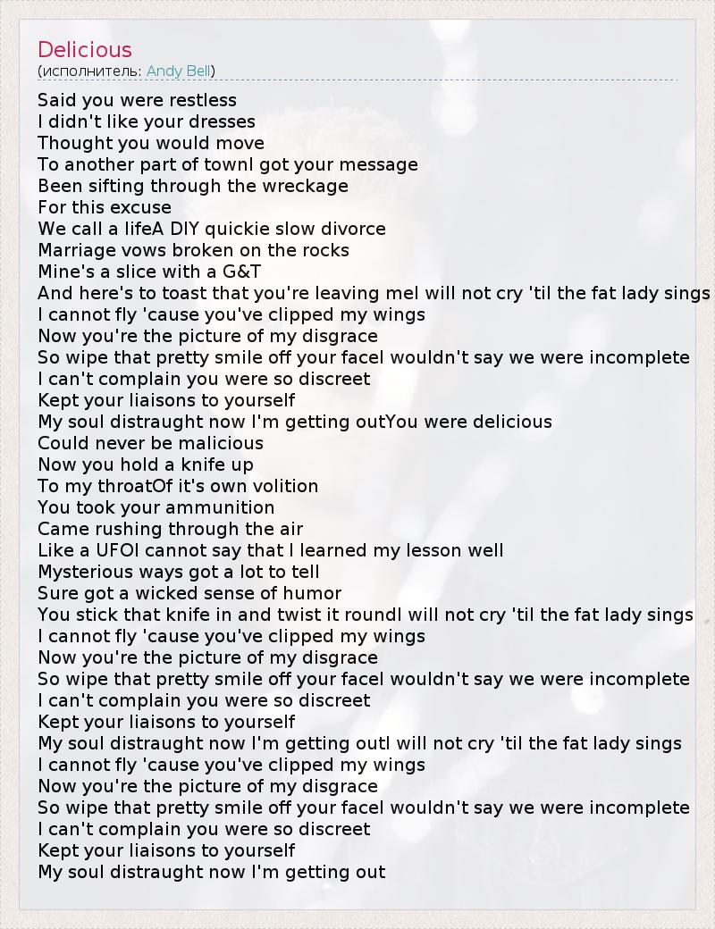 Said you were restless I didn't like your dresses Thought you would move To another part of townI got your message Been sifting through the wreckage For this excuse We call a lifeA DIY quickie slow divorce Marriage vows broken on the rocks Mine's a slice with a G&T And here's to toast that you're leaving meI will not cry 'til the fat lady sings I cannot fly 'cause you've clipped my wings Now you're the picture of my disgrace So wipe that pretty smile off your faceI wouldn't say we were incomplete I can't complain you were so discreet Kept your liaisons to yourself My soul distraught now I'm getting outYou were delicious Could never be malicious Now you hold a knife up To my throatOf it's own volition You took your ammunition Came rushing through the air Like a UFOI cannot say that I learned my lesson well Mysterious ways got a lot to tell Sure got a wicked sense of humor You stick that knife in and twist it roundI will not cry 'til the fat lady sings I cannot fly 'cause you've clipped my wings Now you're the picture of my disgrace So wipe that pretty smile off your faceI wouldn't say we were incomplete I can't complain you were so discreet Kept your liaisons to yourself My soul distraught now I'm getting outI will not cry 'til the fat lady sings I cannot fly 'cause you've clipped my wings Now you're the picture of my disgrace So wipe that pretty smile off your faceI wouldn't say we were incomplete I can't complain you were so discreet Kept your liaisons to yourself My soul distraught now I'm getting out