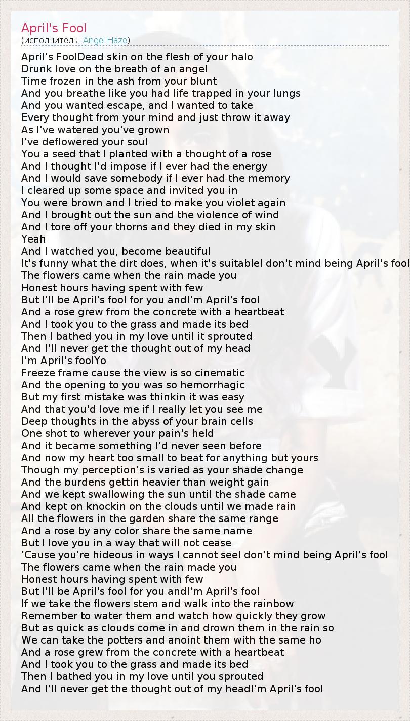 April's FoolDead skin on the flesh of your halo Drunk love on the breath of an angel Time frozen in the ash from your blunt And you breathe like you had life trapped in your lungs And you wanted escape, and I wanted to take Every thought from your mind and just throw it away As I've watered you've grown I've deflowered your soul You a seed that I planted with a thought of a rose And I thought I'd impose if I ever had the energy And I would save somebody if I ever had the memory I cleared up some space and invited you in You were brown and I tried to make you violet again And I brought out the sun and the violence of wind And I tore off your thorns and they died in my skin Yeah And I watched you, become beautiful It's funny what the dirt does, when it's suitableI don't mind being April's fool The flowers came when the rain made you Honest hours having spent with few But I'll be April's fool for you andI'm April's fool And a rose grew from the concrete with a heartbeat And I took you to the grass and made its bed Then I bathed you in my love until it sprouted And I'll never get the thought out of my head I'm April's foolYo Freeze frame cause the view is so cinematic And the opening to you was so hemorrhagic But my first mistake was thinkin it was easy And that you'd love me if I really let you see me Deep thoughts in the abyss of your brain cells One shot to wherever your pain's held And it became something I'd never seen before And now my heart too small to beat for anything but yours Though my perception's is varied as your shade change And the burdens gettin heavier than weight gain And we kept swallowing the sun until the shade came And kept on knockin on the clouds until we made rain All the flowers in the garden share the same range And a rose by any color share the same name But I love you in a way that will not cease 'Cause you're hideous in ways I cannot seeI don't mind being April's fool The flowers came when the rain made you Honest hours having spent with few But I'll be April's fool for you andI'm April's fool If we take the flowers stem and walk into the rainbow Remember to water them and watch how quickly they grow But as quick as clouds come in and drown them in the rain so We can take the potters and anoint them with the same ho And a rose grew from the concrete with a heartbeat And I took you to the grass and made its bed Then I bathed you in my love until you sprouted And I'll never get the thought out of my headI'm April's fool