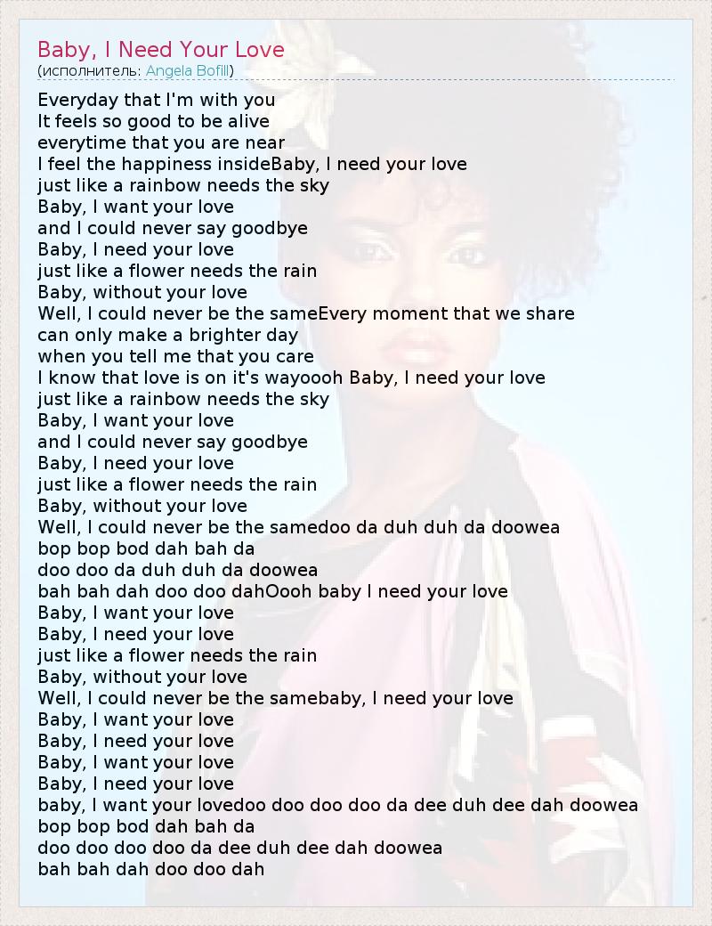 Everyday that I'm with you It feels so good to be alive everytime that you are near I feel the happiness insideBaby, I need your love just like a rainbow needs the sky Baby, I want your love and I could never say goodbye Baby, I need your love just like a flower needs the rain Baby, without your love Well, I could never be the sameEvery moment that we share can only make a brighter day when you tell me that you care I know that love is on it's wayoooh Baby, I need your love just like a rainbow needs the sky Baby, I want your love and I could never say goodbye Baby, I need your love just like a flower needs the rain Baby, without your love Well, I could never be the samedoo da duh duh da doowea bop bop bod dah bah da doo doo da duh duh da doowea bah bah dah doo doo dahOooh baby I need your love Baby, I want your love Baby, I need your love just like a flower needs the rain Baby, without your love Well, I could never be the samebaby, I need your love Baby, I want your love Baby, I need your love Baby, I want your love Baby, I need your love baby, I want your lovedoo doo doo doo da dee duh dee dah doowea bop bop bod dah bah da doo doo doo doo da dee duh dee dah doowea bah bah dah doo doo dah