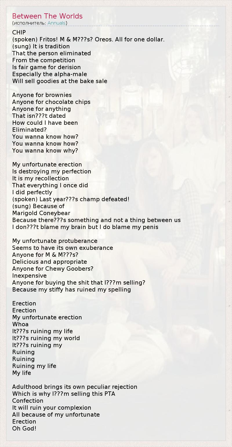 CHIP (spoken) Fritos! M & M???s? Oreos. All for one dollar. (sung) It is tradition That the person eliminated From the competition Is fair game for derision Especially the alpha-male Will sell goodies at the bake sale Anyone for brownies Anyone for chocolate chips Anyone for anything That isn???t dated How could I have been Eliminated? You wanna know how? You wanna know how? You wanna know why? My unfortunate erection Is destroying my perfection It is my recollection That everything I once did I did perfectly (spoken) Last year???s champ defeated! (sung) Because of Marigold Coneybear Because there???s something and not a thing between us I don???t blame my brain but I do blame my penis My unfortunate protuberance Seems to have its own exuberance Anyone for M & M???s? Delicious and appropriate Anyone for Chewy Goobers? Inexpensive Anyone for buying the shit that I???m selling? Because my stiffy has ruined my spelling Erection Erection My unfortunate erection Whoa It???s ruining my life It???s ruining my world It???s ruining my Ruining Ruining Ruining my life My life Adulthood brings its own peculiar rejection Which is why I???m selling this PTA Confection It will ruin your complexion All because of my unfortunate Erection Oh God!